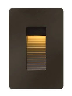 Hinkley’s 120V Luna Vertical Step Light features a Titanium, Satin White, Satin Black, Bronze or Matte Bronze finish. 2700K and 3000K options available. Made from die cast zinc aluminum alloy. Fits in standard junction box and accepts any Decorator Switch Plate Cover. Dimmable with any universal dimmer. Accessories included: Wiring kit. One 4 watt 120 volt LED module is included. 3 inch width x 4.5 inch height x 1.5 inch depth. UL listed for wet locations.