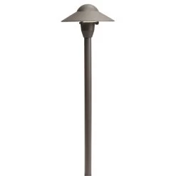 15470 Dome Path Light is made of cast brass in Bronzed Brass finish or cast aluminum in Textured Black, Textured Architectural Bronze, or Centennial Brass finishes. One 12 volt, T5 wedge base LED bulb up to 2 watts is required, but not included. Includes 8 inch ground stake, cable connector and 24 inch lead wires. UL listed. Suitable for wet locations. Not for use with electronic transformers. Requires low voltage magnetic transformer, sold separately.
