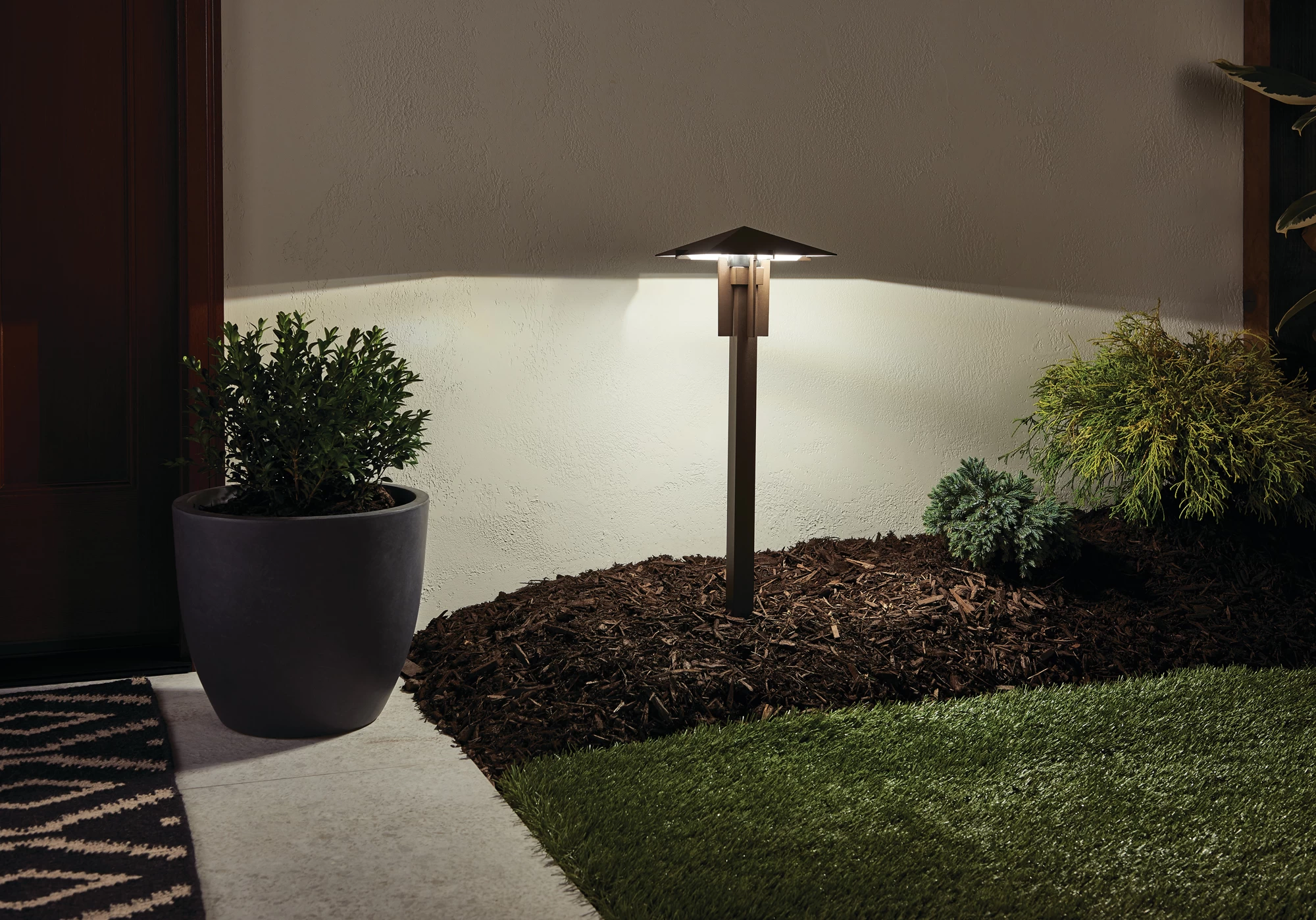Mission Path Light features a cast aluminum construction with a Textured Architectural Bronze finish. Includes 3.8 watt 12 volt 80CRI LED module and constant current driver. Choice of 2700K Warm White or 3000K Pure White color temperature. Includes 8 inch in-ground stake, 24 inch leads, and cable connector. 8 inch width x 26.2 inch height. ETL listed for wet locations. Low voltage magnetic transformer required, sold separately. Not for use with electronic transformers.