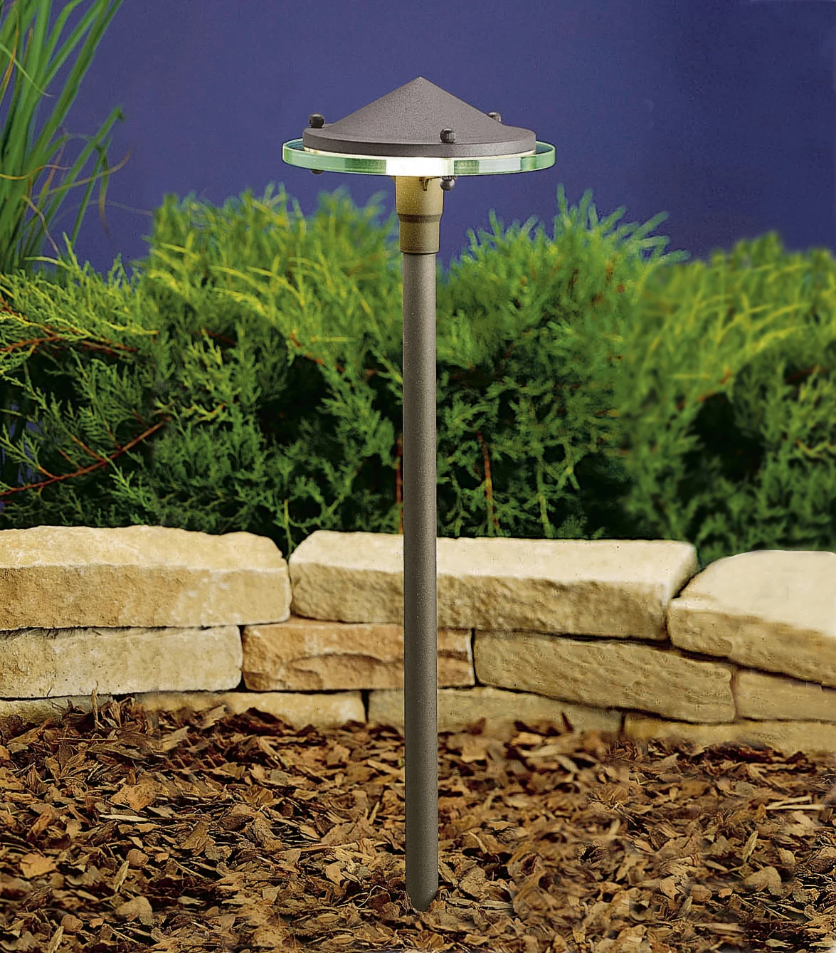 The 12 Volt Glass & Metal Path Light is a modern original that combines contemporary style with smooth illumination. Available in Brushed Nickel or Textured Architectural Bronze finish. One 12 volt, S8 wedge base LED bulb up to 2 watts is required, but not included. Includes 8 inch in-ground stake, 24 inch leads, and cable connector. UL listed. Suitable for wet locations. Required transformer sold separately.