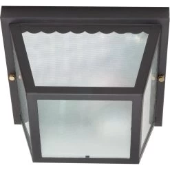 604 Outdoor Ceiling Flush Mount features Frosted glass with a White, Textured Black, Old Bronze, or Polished Brass finish. Two 60 watt, 120 volt A19 type Medium base incandescent bulbs are required, but not included. UL listed for wet locations. 9.25 inch width x 5 inch height.