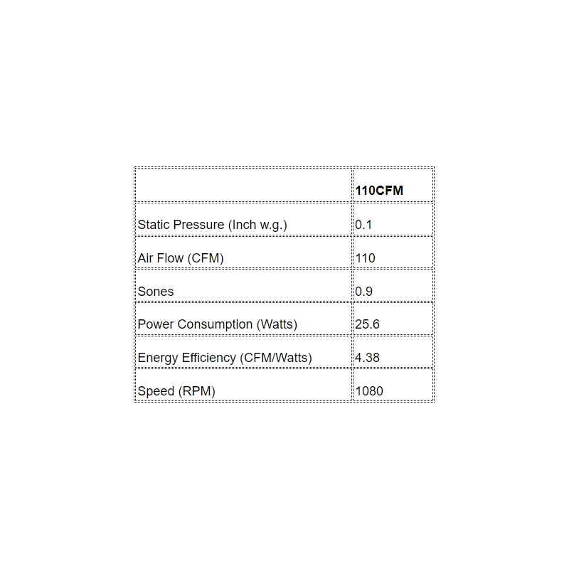 A high flow speed of 50, 80, or 110 CFM and a continuous lower speed can be set using switches in the fixture. The humidity sensor can activate high airflow when humidity rises above a level set by the user (50-100%).