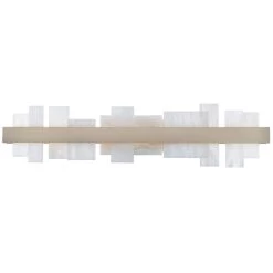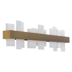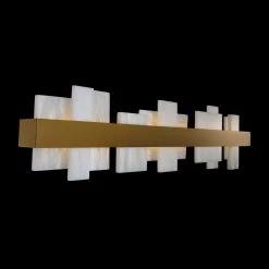 The Acropolis Bathroom Vanity Light features illuminated Spanish alabaster plates displayed behind a sleek metal band. Contrast between the straight-lined geometric design and the natural veining that flows through the stone creates a unique modern look for your bathroom or powder room. This fixture can be mounted horizontally or vertically. It uses AC LED driverless technology and is dimmable with a TRIAC or ELV dimmer, sold separately.