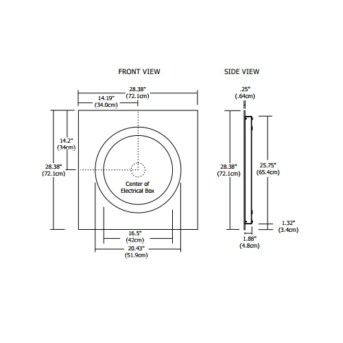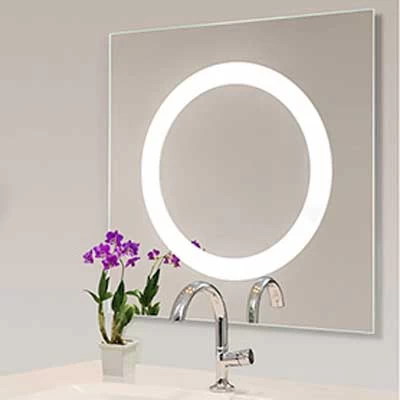 Alice LED Surface Mount Square Mirror features Very Warm White 2700K color temperature LEDs set behind a round inset of frosted glass projecting an even glow of light. Includes 96 total watts LED, consuming 85 watts, 92+CRI, 1296 lumens. 50,000 hour average lamp life. Dimmable with a low voltage electronic dimmer, sold separately. ETL listed. ADA compliant. Title 24/JA8 compliant. 28.375 inch width x 28.375 inch height x 2.13 inch depth. 28 pounds. Note: This is a discontinued model and limited to quantity on hand.