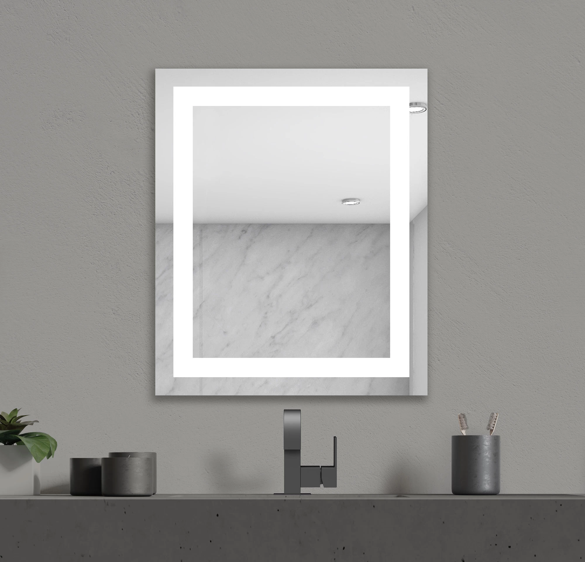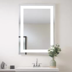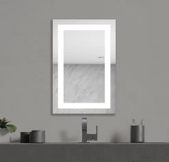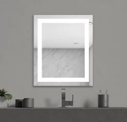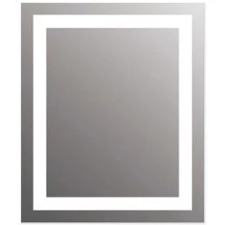 The Allegro Lighted Mirror features 2.6 inch frosted glass edges on either side of the mirror, casting a beautiful glow on the wall and increases the amount of usable vanity lighting. Available in two sizes. Mounts Vertically. ETL listed. Damp Location. Title 24 compliant.