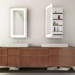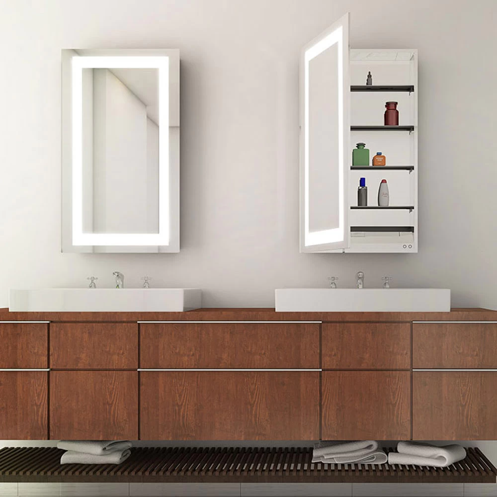 The Ambiance Lighted Medicine Cabinet features a frame of lustrous light and a precision-polished edge, an ideal match for contemporary decor. Features includes: corrosion-resistant glass, integrated defogger, mirrored interior with top light, adjustable glass shelves, interior 20 Amp 120VAC GFCI receptacle, two electrical outlets and four USB Ports. Surface mount kit included. Forward phase dimming or on/off wall switch.