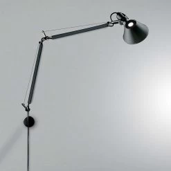 Tolomeo Mini Wall Light with S Bracket (cord and plug) features a fully articulated arm, body structure and diffuser in extruded natural anodized Aluminum, Black or White. Joints and tension control knobs in polished die-cast aluminum and tension cables in stainless steel. Type S suitable for wall surface mounting with cord and plug. Diffuser is tiltable and is 360 degree rotatable on lampholder. On/off switch. Requires one 100 watt, 120 volt A19 type medium base incandescent lamp, but is not included. UL listed. 5 7/8 inch diameter shade. 26 3/8 inch height x 28 depth x 43 11/16 inch fully extended arm.