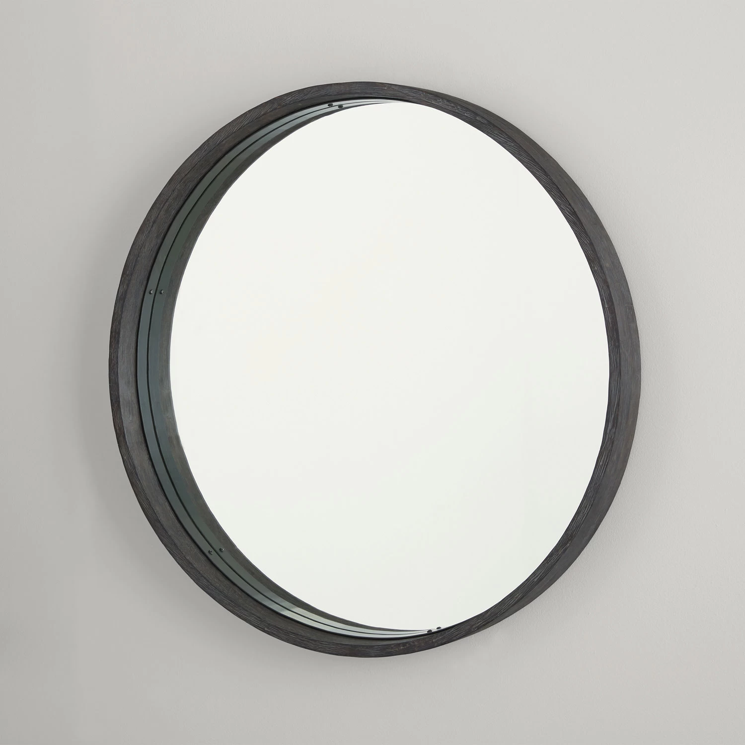 The Ashton Round Mirror features wire brushed mango wood finished in Carbon Grey with Grey Iron finished metal trim. Includes wire hanger.