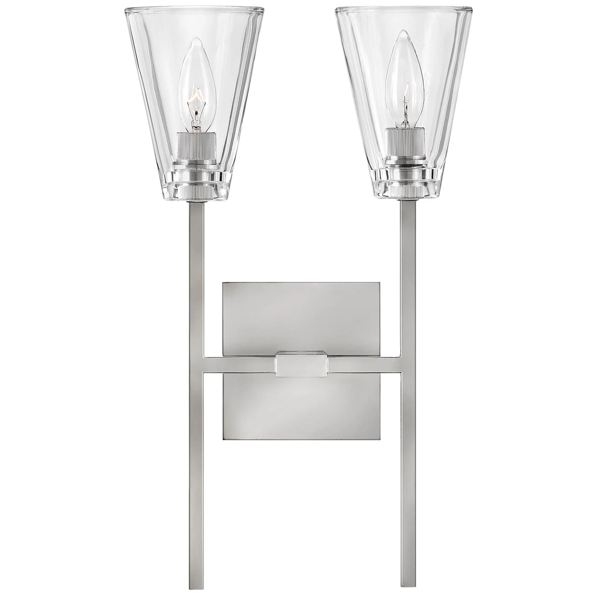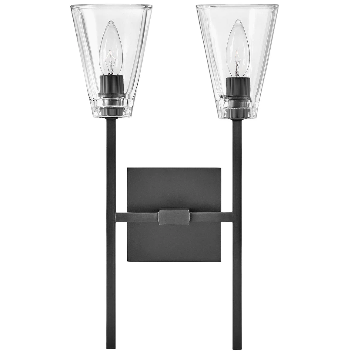 The Auden Bathroom Vanity Light showcases a dramatic minimalist design with refined details. Thick clear glass shades gleam against elegant, elongated stems and a sleek square backplate.