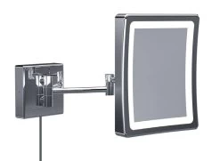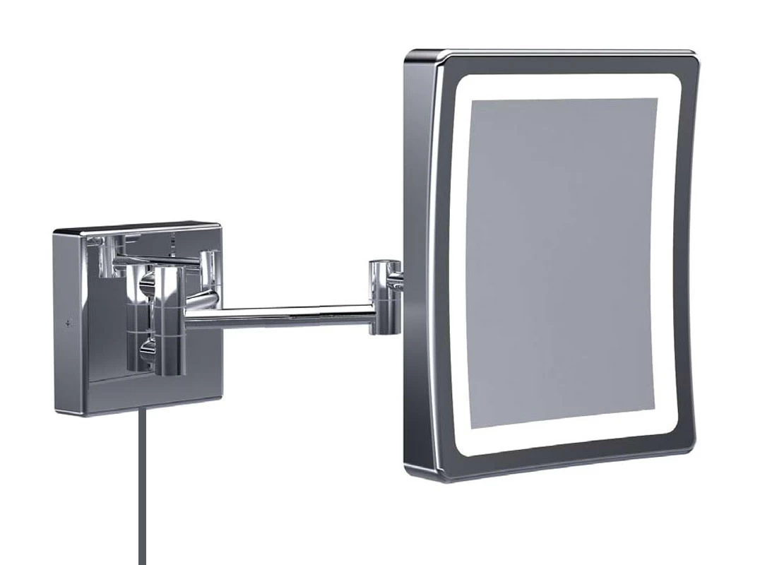 The Baci Basic Double Arm Wall Mirror is constructed of corrosion resistant materials and optical quality 5x magnification glass mirror with natural white LED lighting. Available with a Satin Nickel, Bronze, or Chrome finish in hardwired or plug-in options. Damp location rated. UL listed.