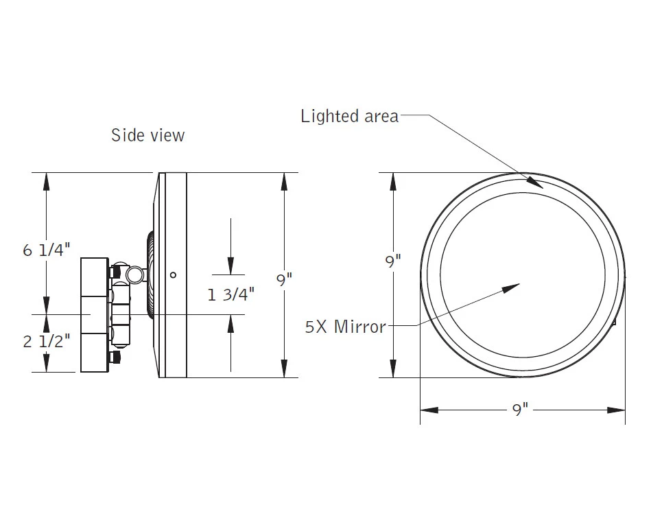 Baci Junior Double Arm Round Body Wall Mirror has a solid brass construction and optical quality 5x magnification glass mirror with high power natural white LED lighting. Finishes in Satin Nickel, Polished Nickel, Bronze, or Chrome. Damp location rated. UL listed.