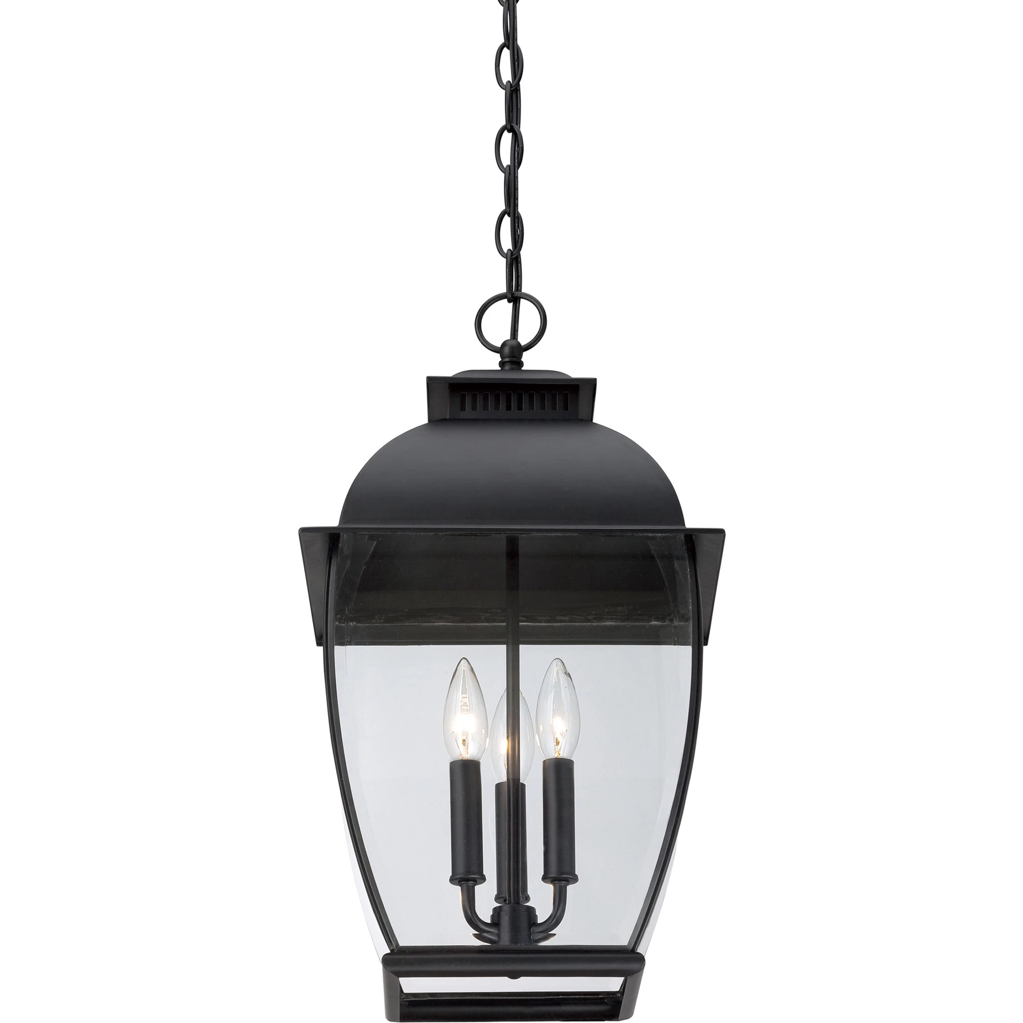Bain Outdoor Pendant is a transitional style that complements many architectural styles and gives the exterior of your home both beauty and security. It has a classic silhouette featuring clear beveled glass for optimum light output. Finished in Mystic Black. Three 60 watt 120 volt B10 candelabra base bulbs are required, but not included. ETL listed for damp locations. 11.5 inch width x 20.5 inch height x 96 inch length.