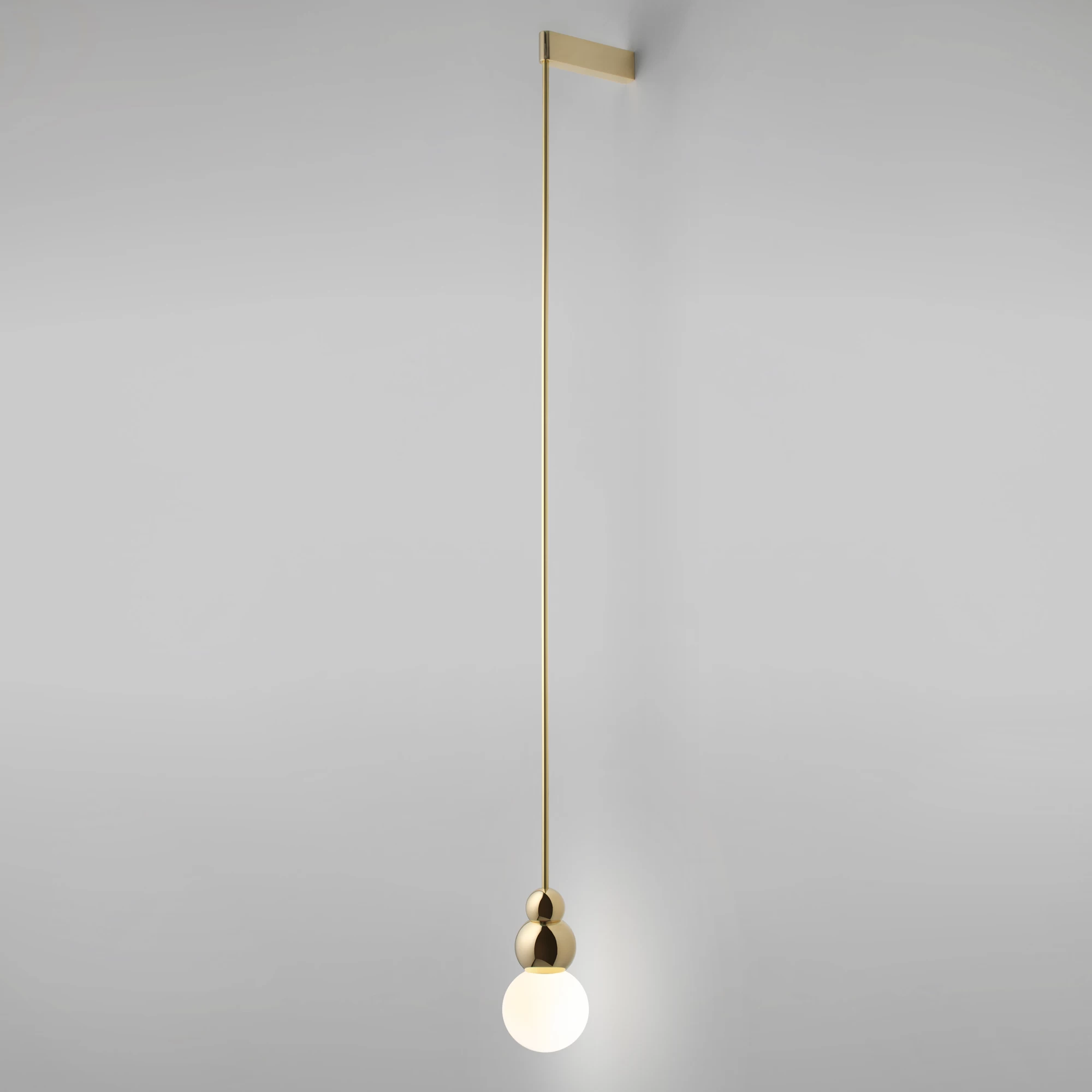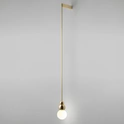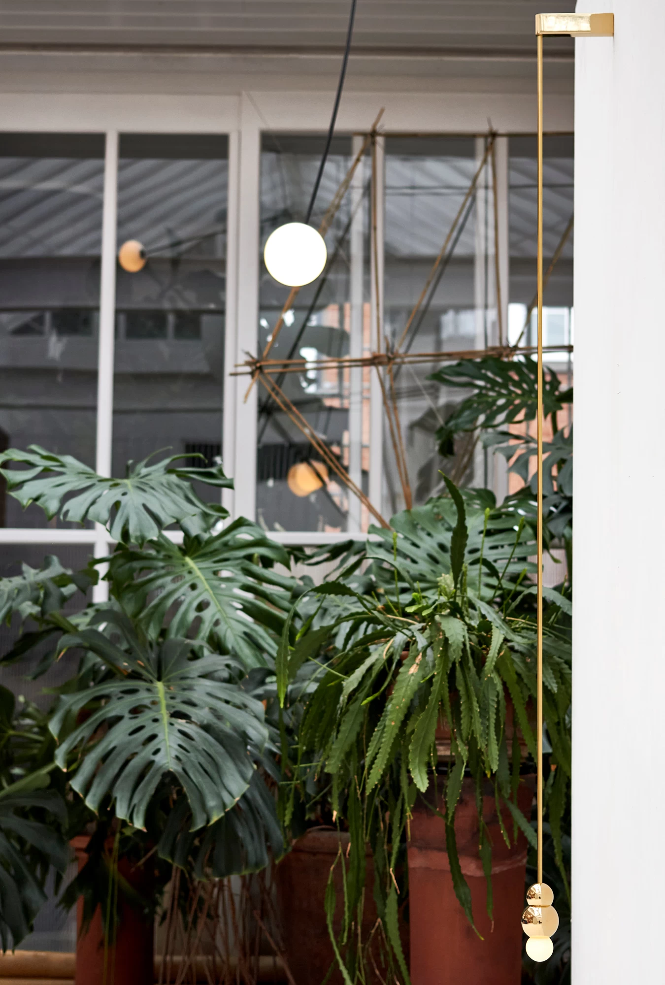 The Ball Rod Bracket Wall Light, designed around the classic incandescent bulb, is an exercise to abstract the bulb into a perfectly spherical ball, celebrating its perfect shape by repeating it in metal. The brass finish is unlacquered and will naturally oxidize and darken over time.