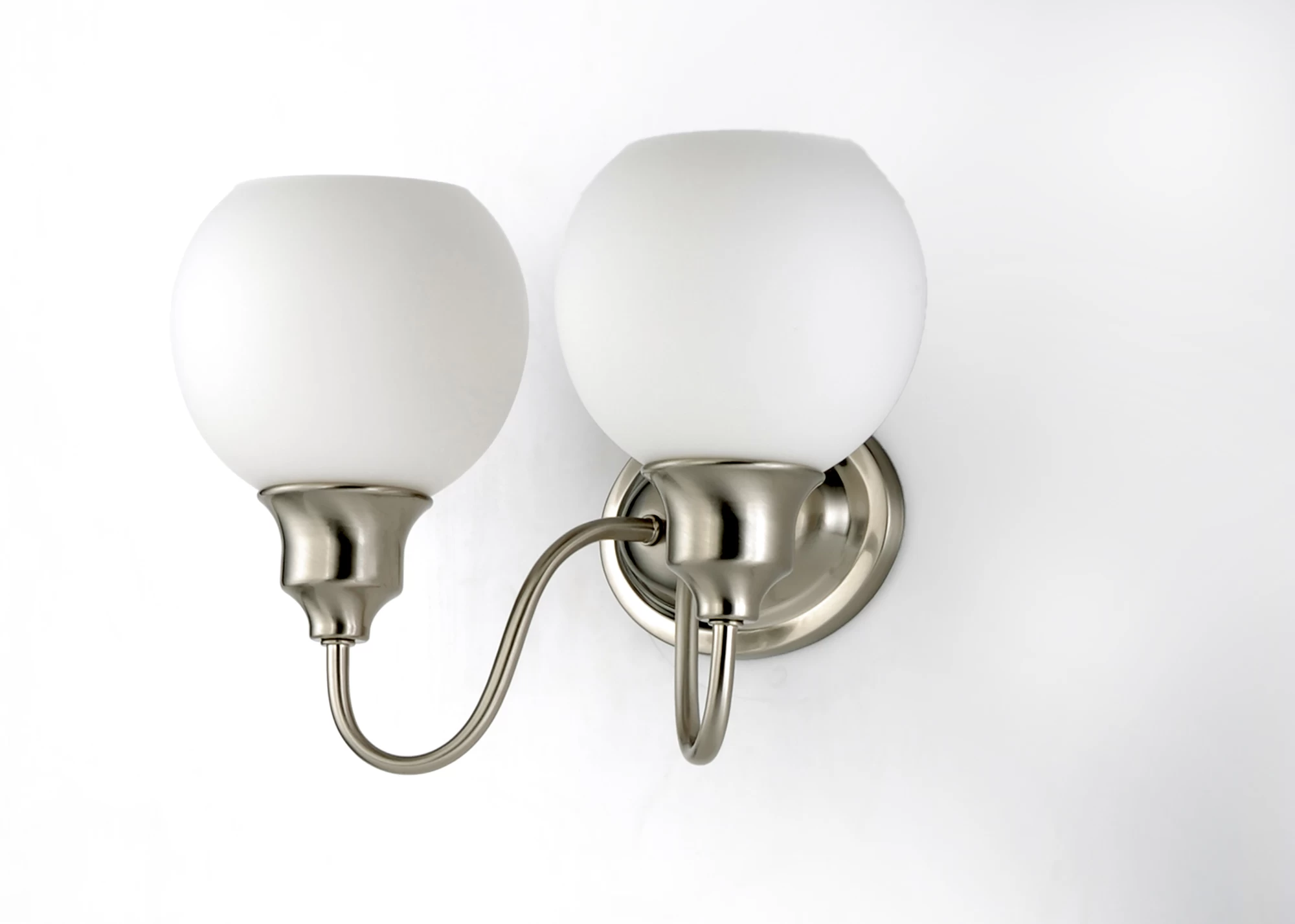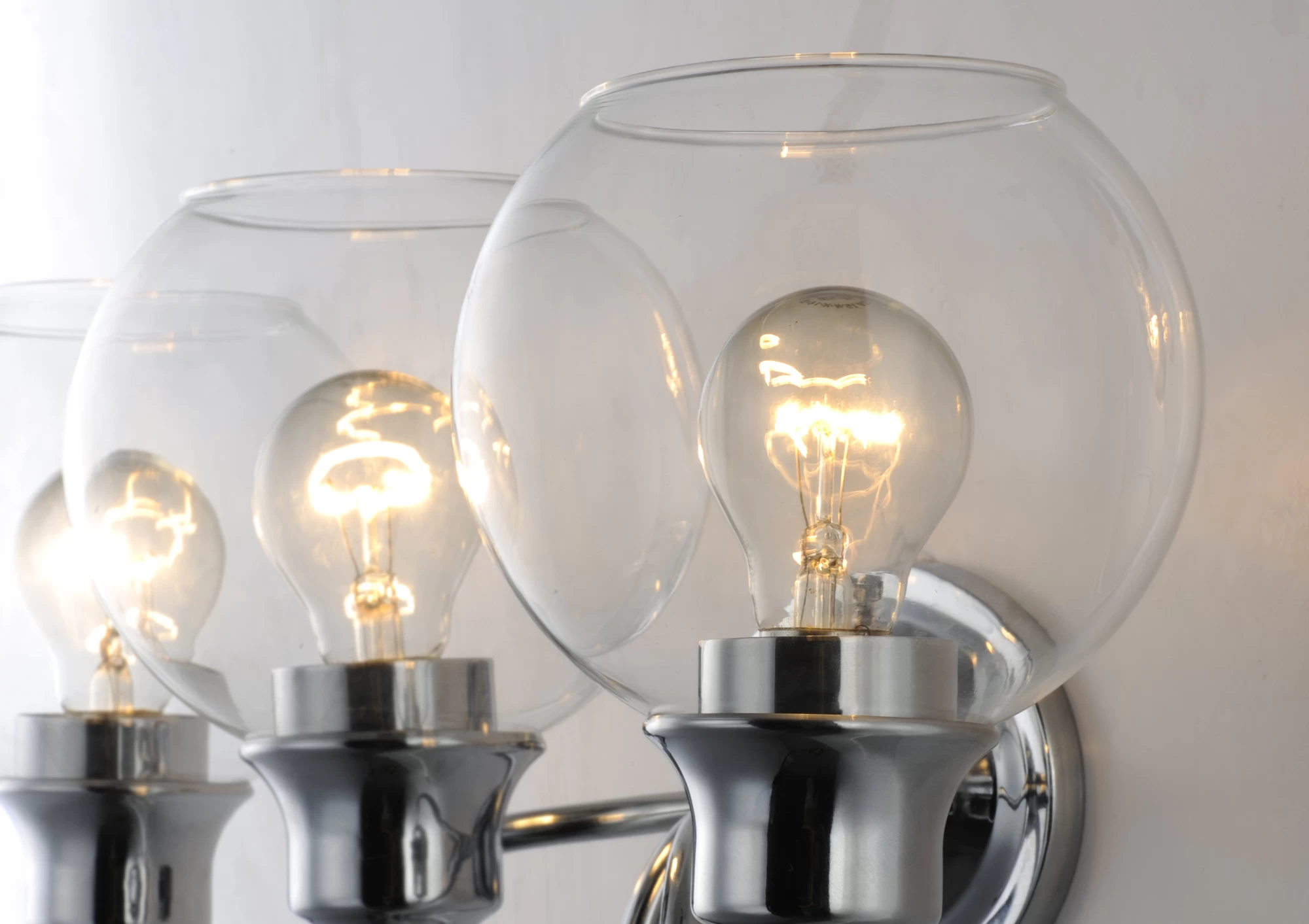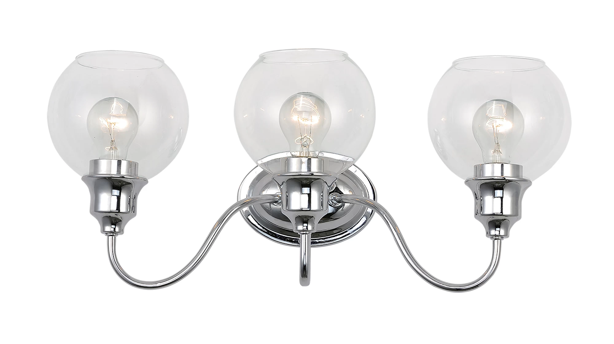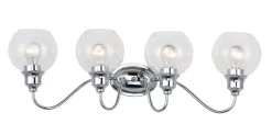 Bollard Barthroom Vanity Light has curved arms that support circular glass with an open bottom which can be installed facing up or down. Available with Clear glass with Polished finish or Satin White glass with a Satin nickel finish, in 2, 3, and 4 light options. Dampo location rated. UL listed.