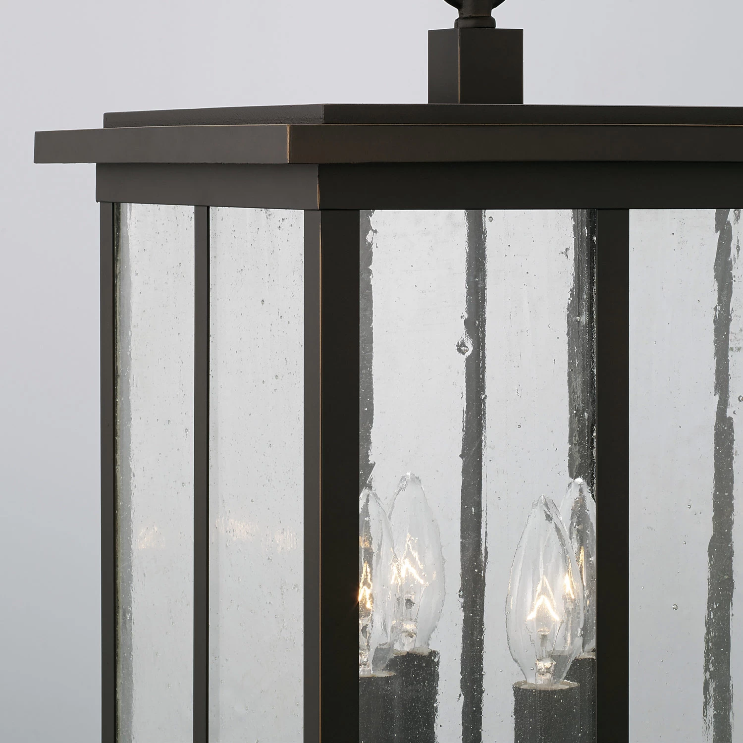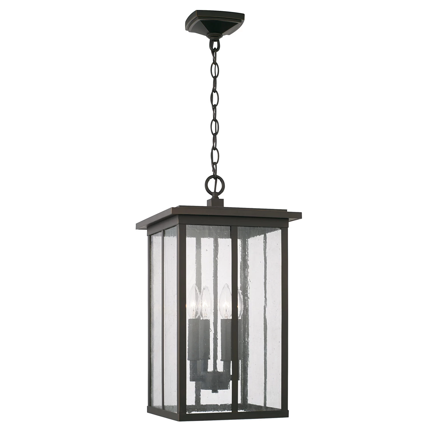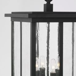 With its dark frame and antiqued water glass panels, the outdoor Barrett Chandelier is reminiscent of traditional lanterns, while its strong vertical lines hint at classic mission style. The textured glass diffuses the light and lets a cozy, warm glow shine through to light your porch or patio. Suitable for use in outdoor covered locations.