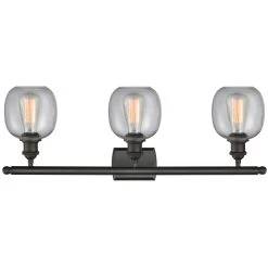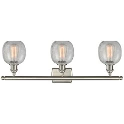 The Belfast Bathroom Vanity Light features a row of gently curved glass shades supported by a sleek horizontal bar and rectangular backplate. The shades are available in Crackle or Seedy clear glass to provide a touch of texture to the fixture’s sleek modern lines.