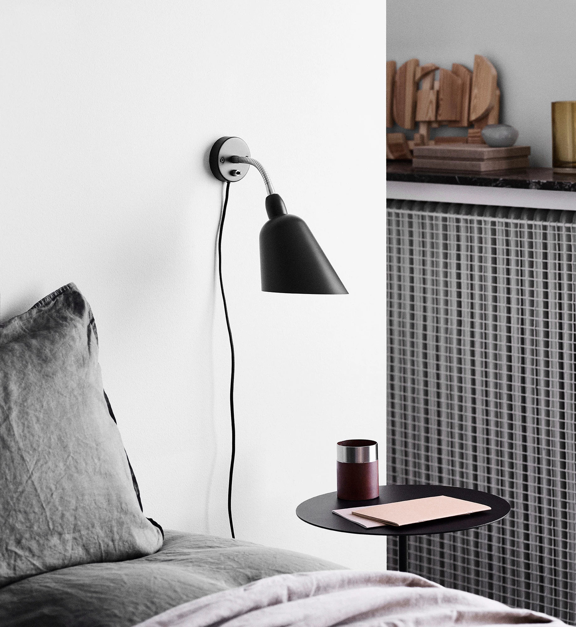 Embodying the sculptural simplicity and functionalism of Danish minimalism, the Bellevue AJ9 Plug-in Wall Light features a spun metal shade and slim adjustable arm. Its graceful lines and clean silhouette integrate well into any interior style. On/off switch on backplate.