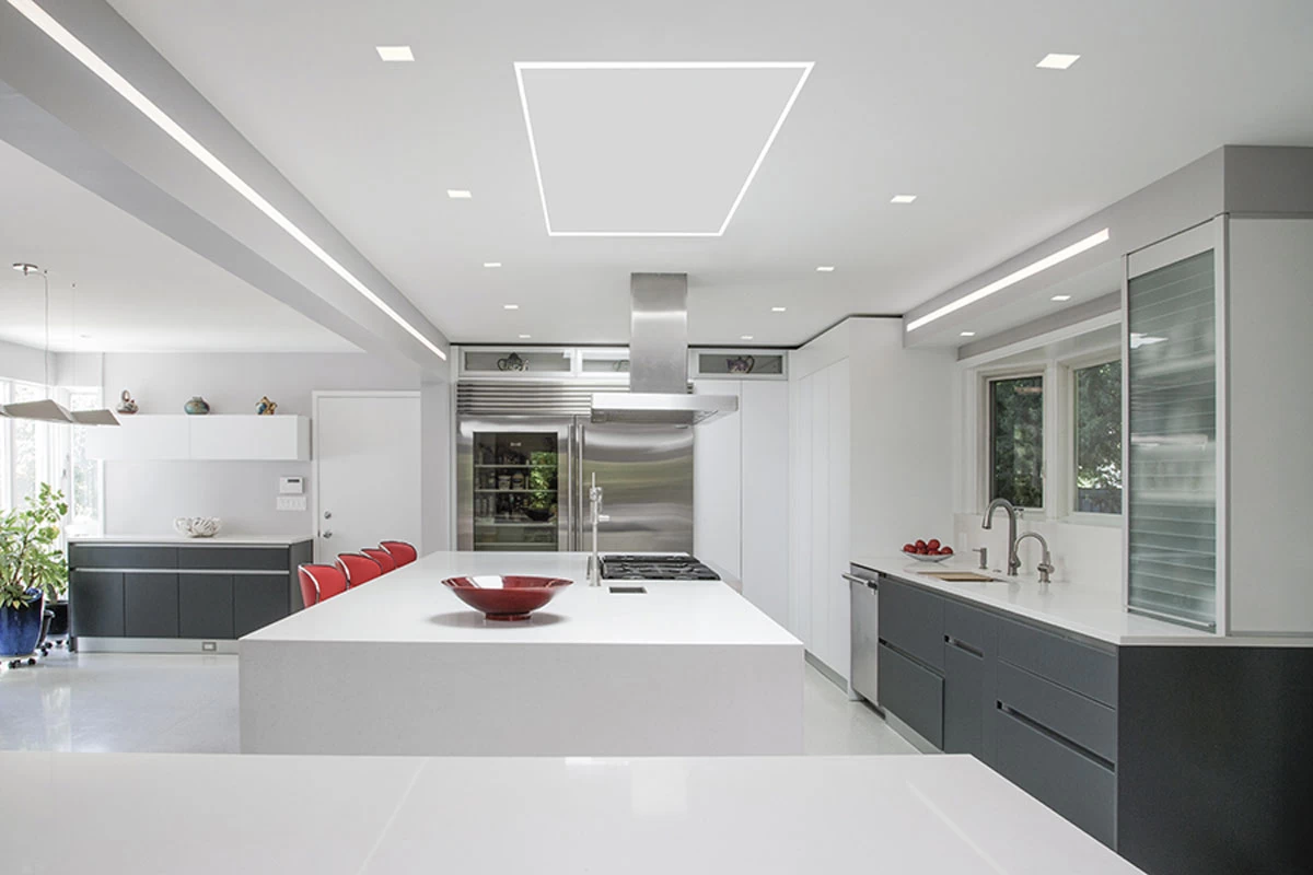The Innovative Build-It-Yourself (BIY) TruLine 1.6A linear plaster-in system, pioneered by PureEdge Lighting, recesses into 5/8 inch drywall without any joist modification. Redefining the relationship between lighting and interior design, this innovative and highly efficient system blends seamlessly into the drywall, becoming part of the architecture.