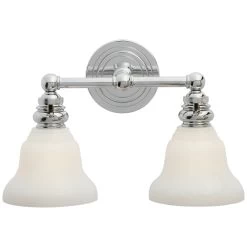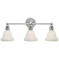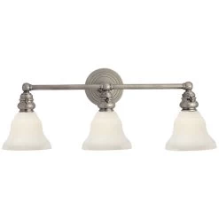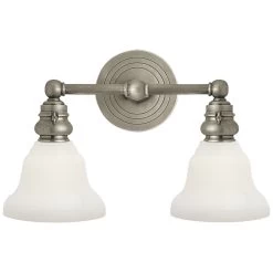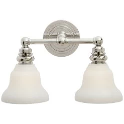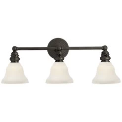 The Boston Glass Functional Bathroom Vanity Light brings a simple, effortless look to your interior space. The industrial frame is softened by glass desk shades, that cast warm shadows across your room. Hi/Lo switch is located on each lamp socket.