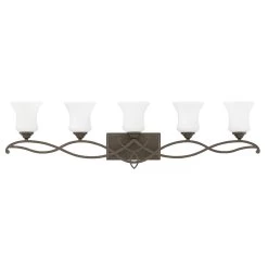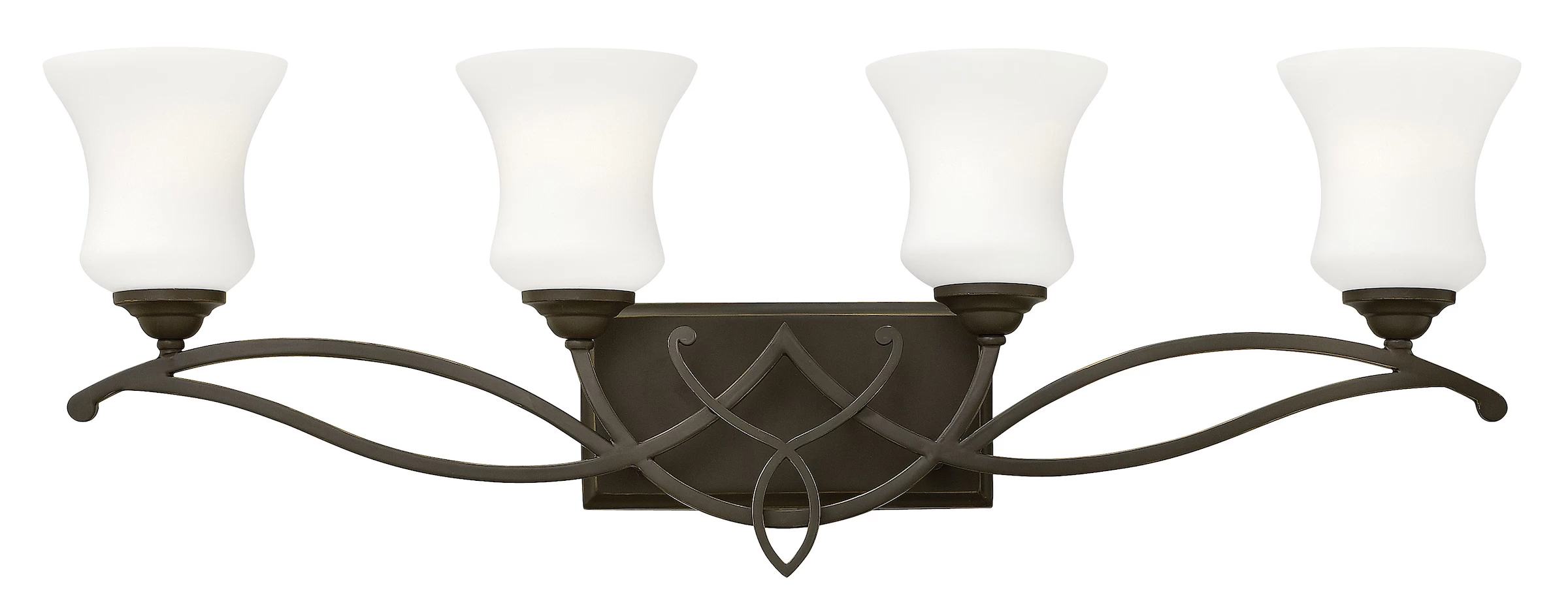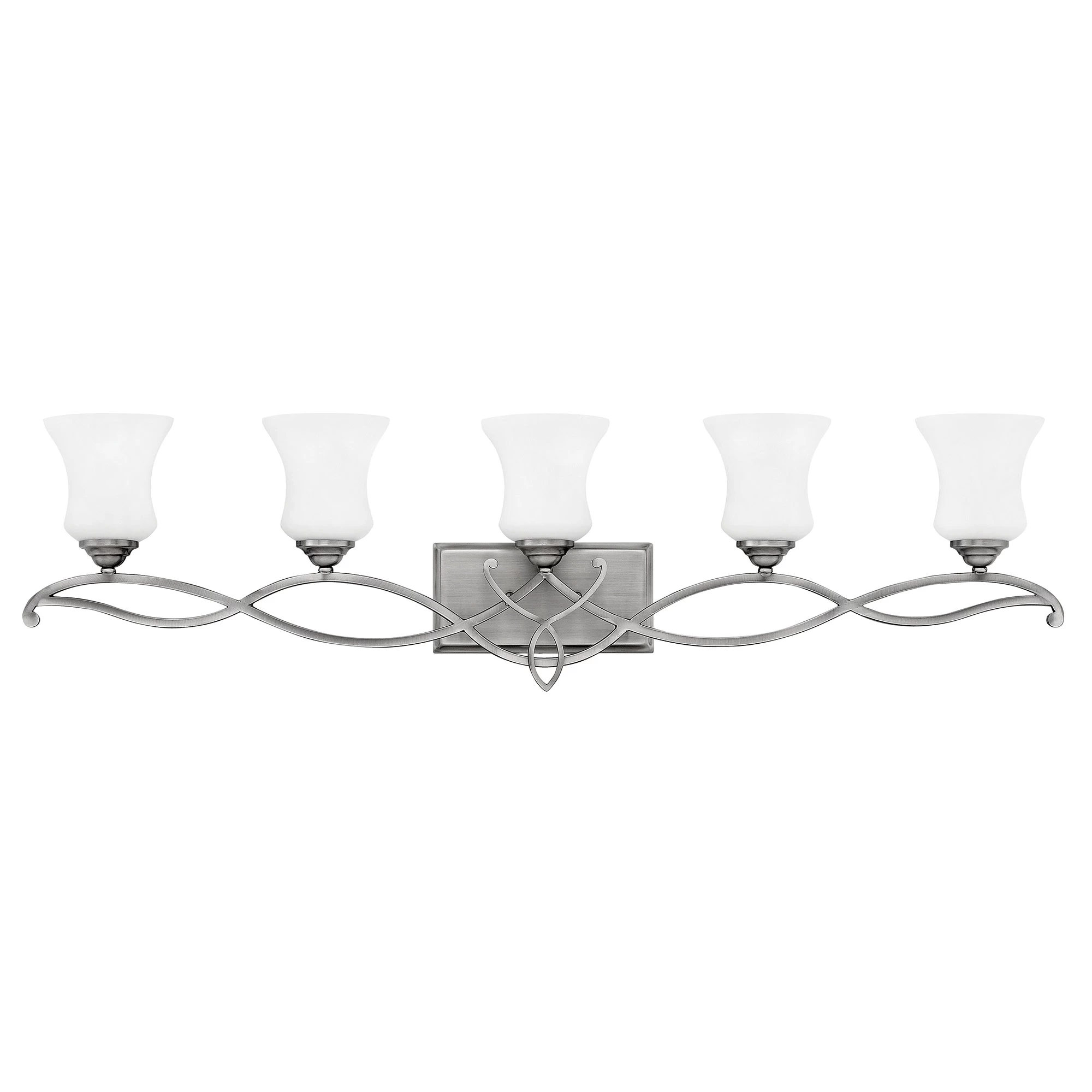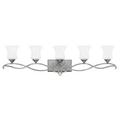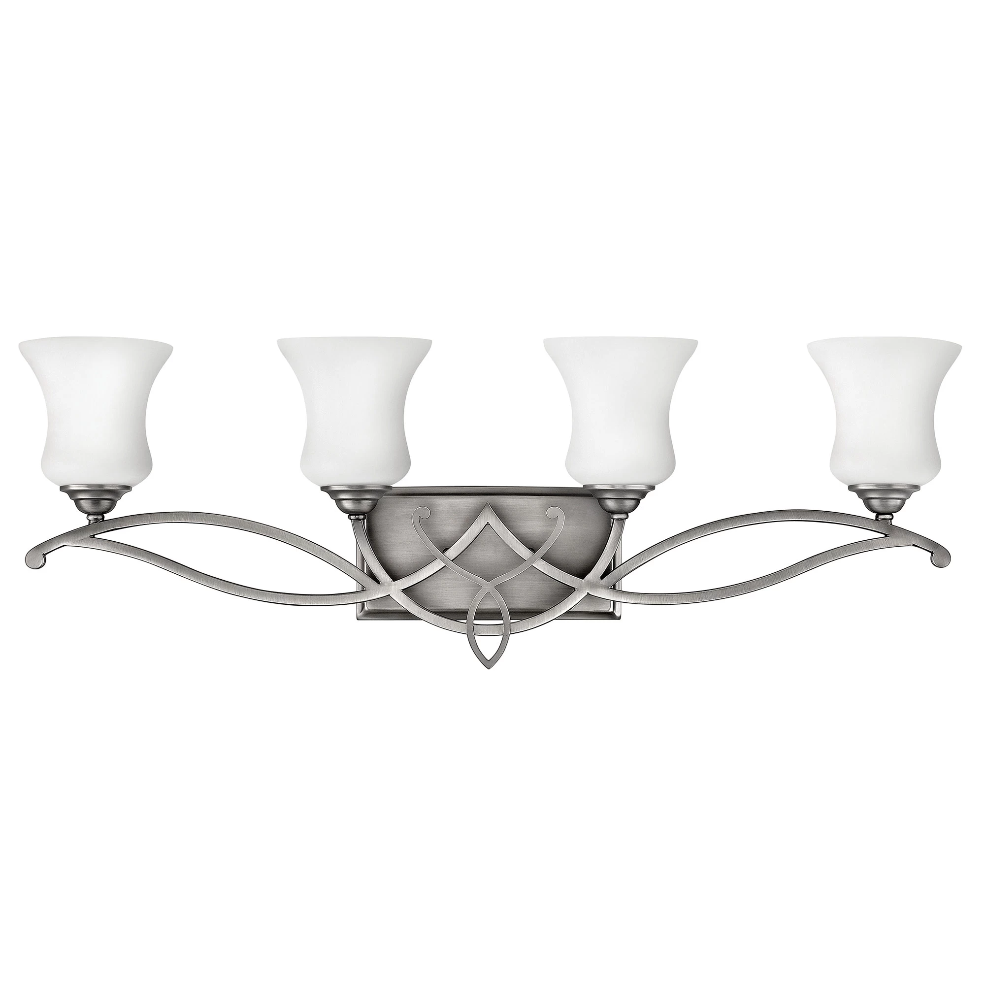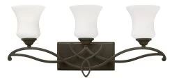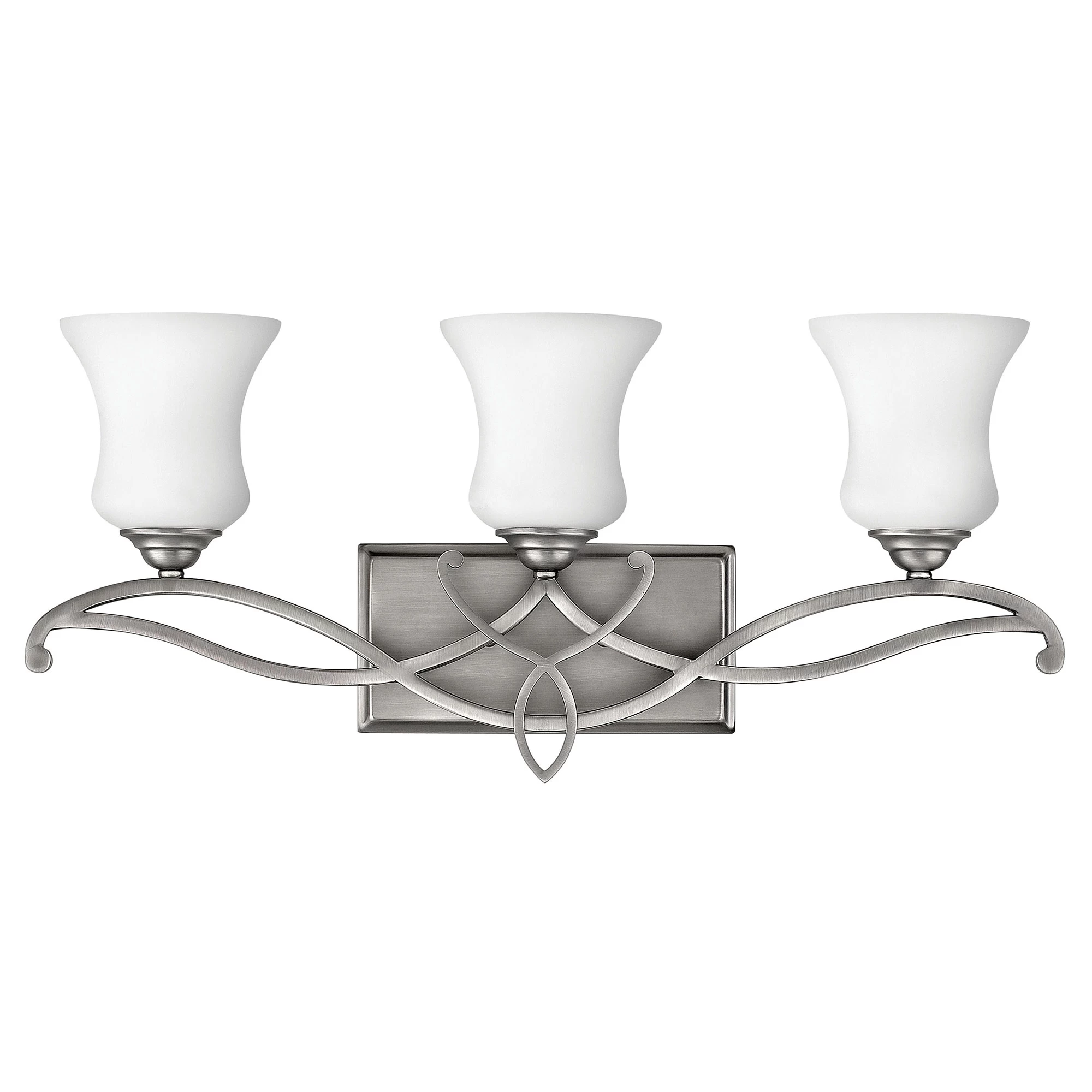 The Brooke Bathroom Vanity Light features an Antique Nickel, Silver Leaf, or Olde Bronze finish with Etched Opal Glass shades.
