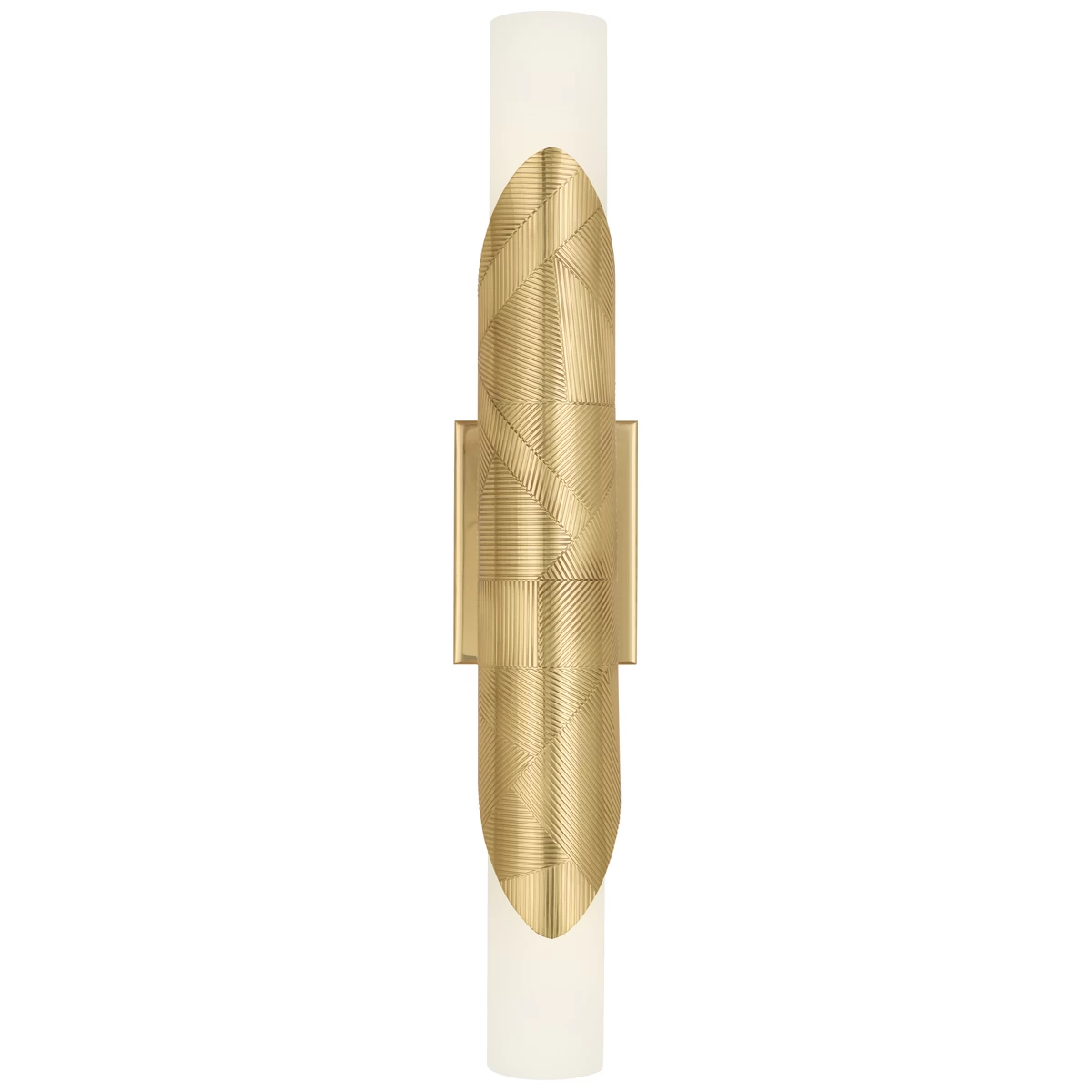 The Brut Double Light Wall Sconce features an etched metal body wrapped around a double cylindrical light with a frosted glass shade, and highlights the touch of art deco that designer Michael Berman is known for. Available in Modern Brass or Deep Patina Bronze finishes. UL listed for damp locations. ADA compliant.