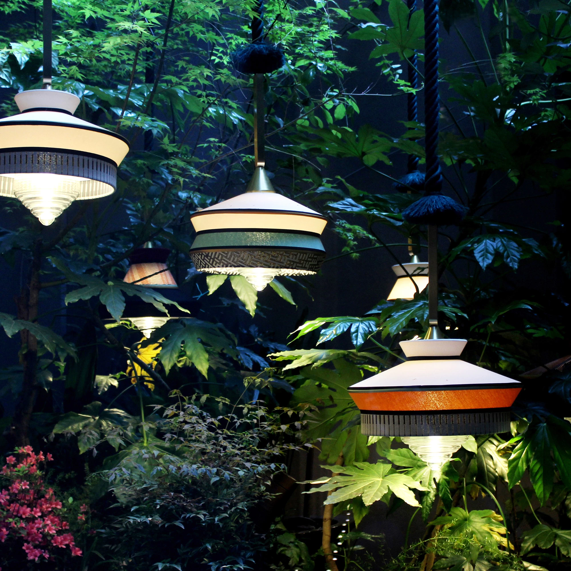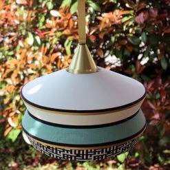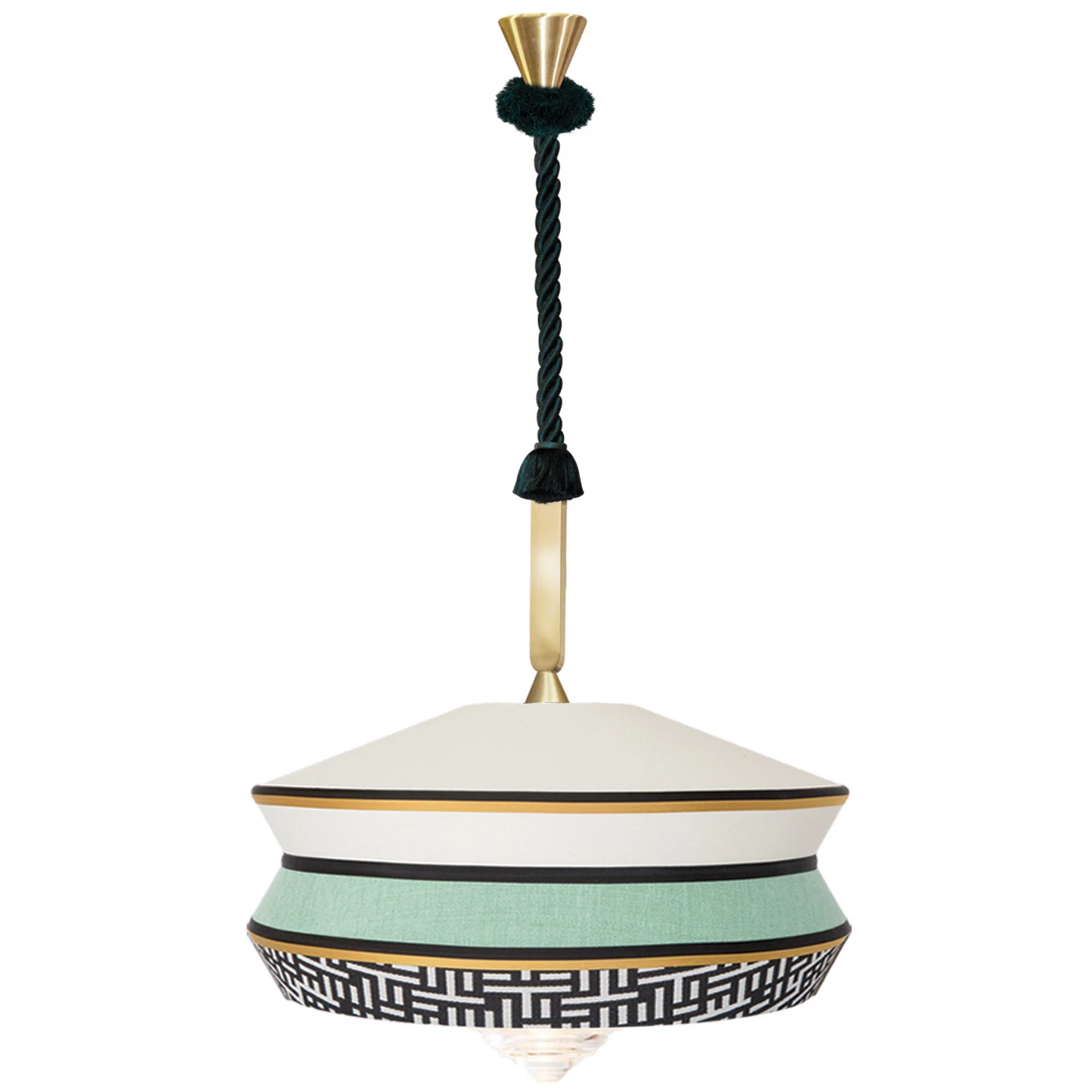 The Calypso Antigua Pendant is a collection of lamps inspired by the forties. They show a connection with the tropical and Southern American world, where the European deco style, characterized by geometric lines and black and whites, is twisted and revitalized thanks to bright colors, patterns, and twine. Features a Satin Brass finish with a clear glass diffuser. Includes a green waterproof braided suspension cord.