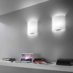 The Celine Wall lamp floats a simple half drum-shaped handblown glass diffuser on the wall. The Celine was designed by Leucos Design Lab to be a minimal and warm solution versatile enough for many applications. Available in Brushed Nickel with Satin White glass in small and large sizes with incandescent or LED lamping options. Small is ADA compliant.