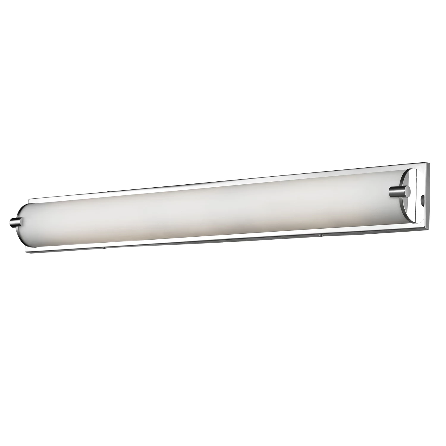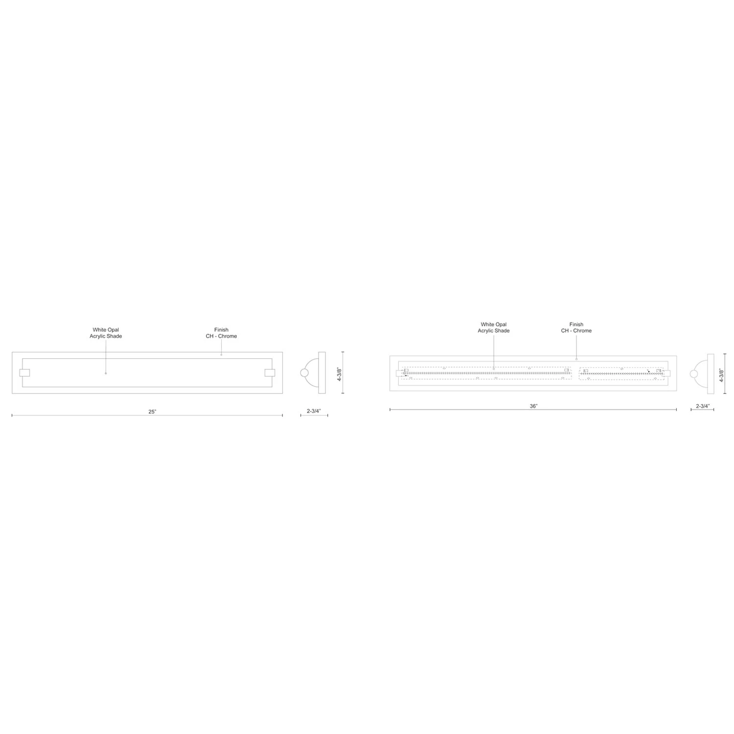 Charlotte Bathroom Vanity Light features White Opal half glass cylinder and frosted side covers, with metal side covers available in Chrome. Available in small and large sizes. Built in LED module totaling 27/40 watts is included. ADA compliant. Damp location rated. ETL listed. Small: 25 inch width x 4.38 inch height x 2.75 inch depth. Large: 36 inch width x 4.38 inch height x 2.75 inch depth.