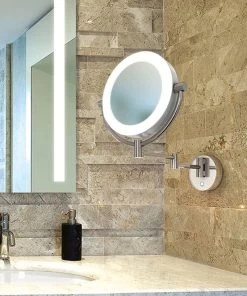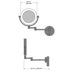 The Charm Wall Mount Makeup Mirror features forward facing task lighting with dual 5X / 1X magnification, and an articulated arm for near and far viewing. Side to side swivel with full pivot, up and down tilt, and double arm to flatten against the wall. Requires a standard 3.5 or 4 inch octagonal electrical box. On/off switch on canopy.