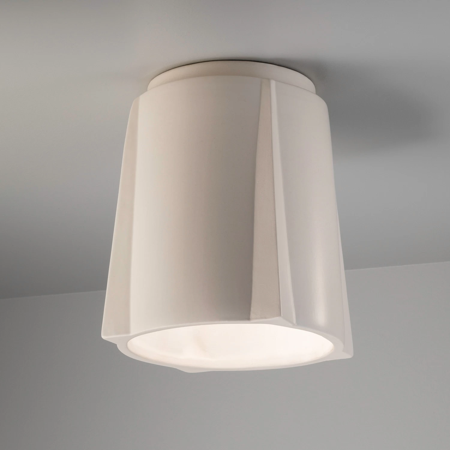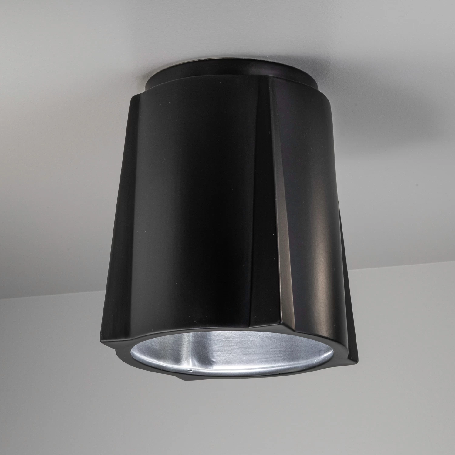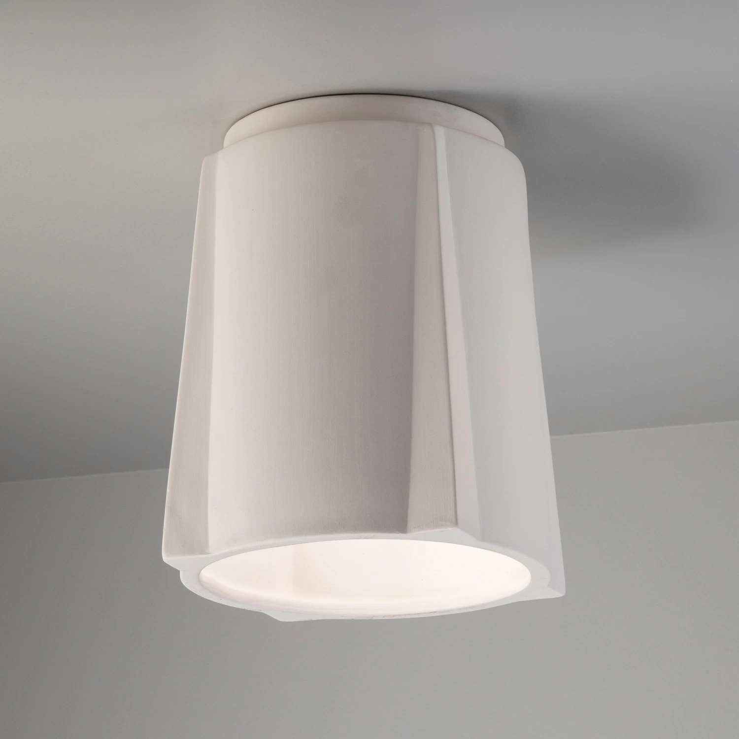 The Compass Outdoor Ceiling Flush Light brings a clean detailed look to a variety of exterior styles. The pinched cone shaped shade is lined to reflect the light and available in Carbon, Matte White, Canyon Clay, and Bisque with Incandescent or integrated LED lamping options. Bisque option is in its natural form and can be painted to your desired color. Wet location rated. Made in the USA. UL listed.