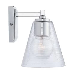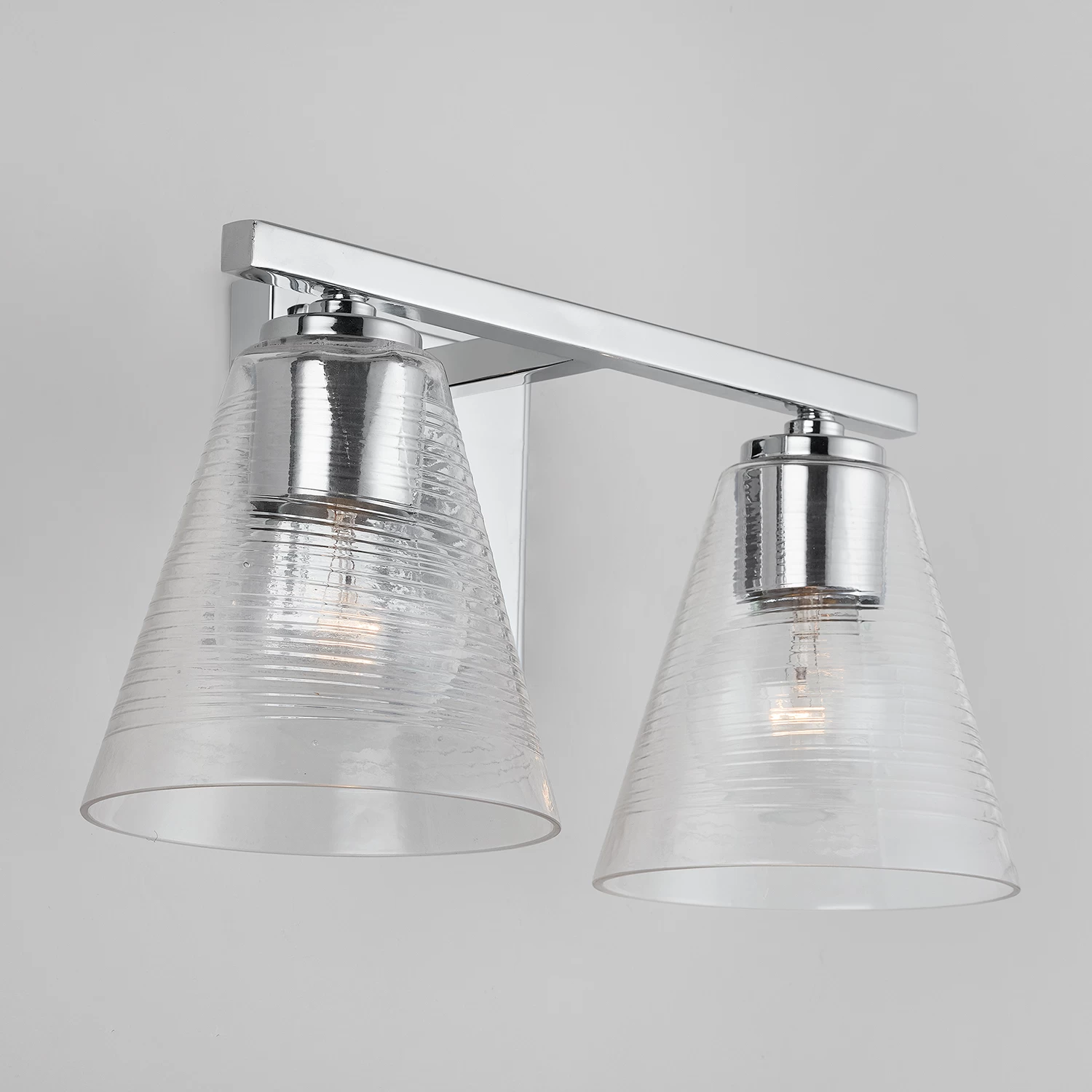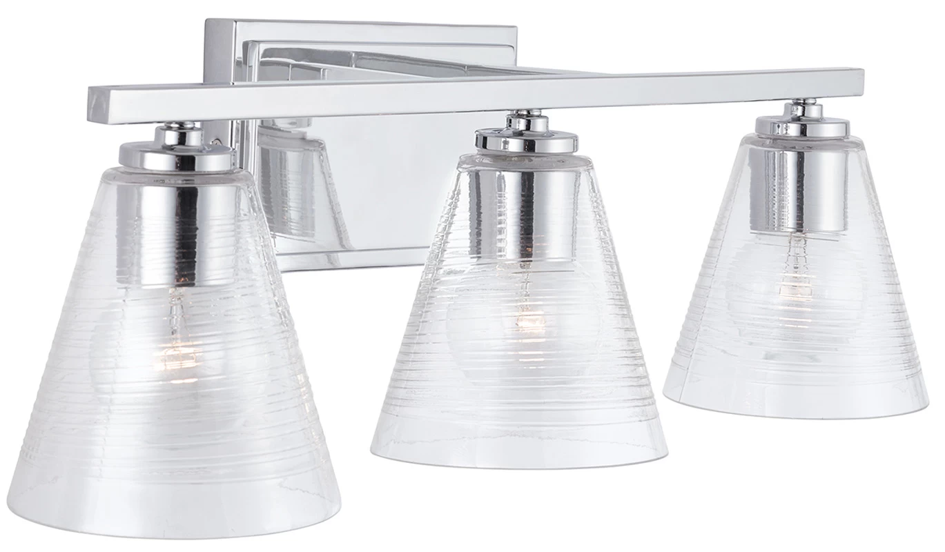 The Cone Bathroom Vanity Light brings a clean detailed look to a variety of interior styles. Ribbed Clear cone shaped glass diffusers are complemented by a Chrome finish. Available in 2 and 3 light options. Damp location rated. UL listed.