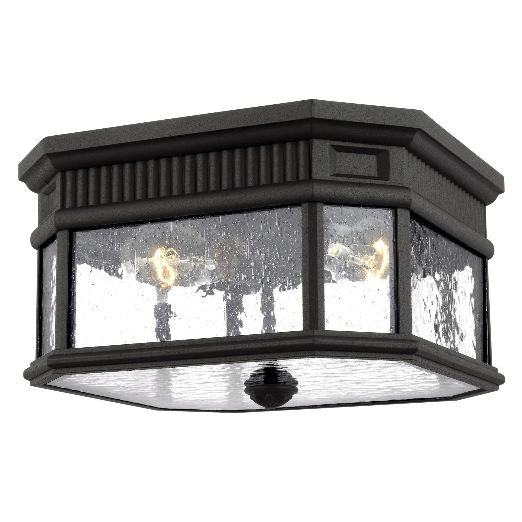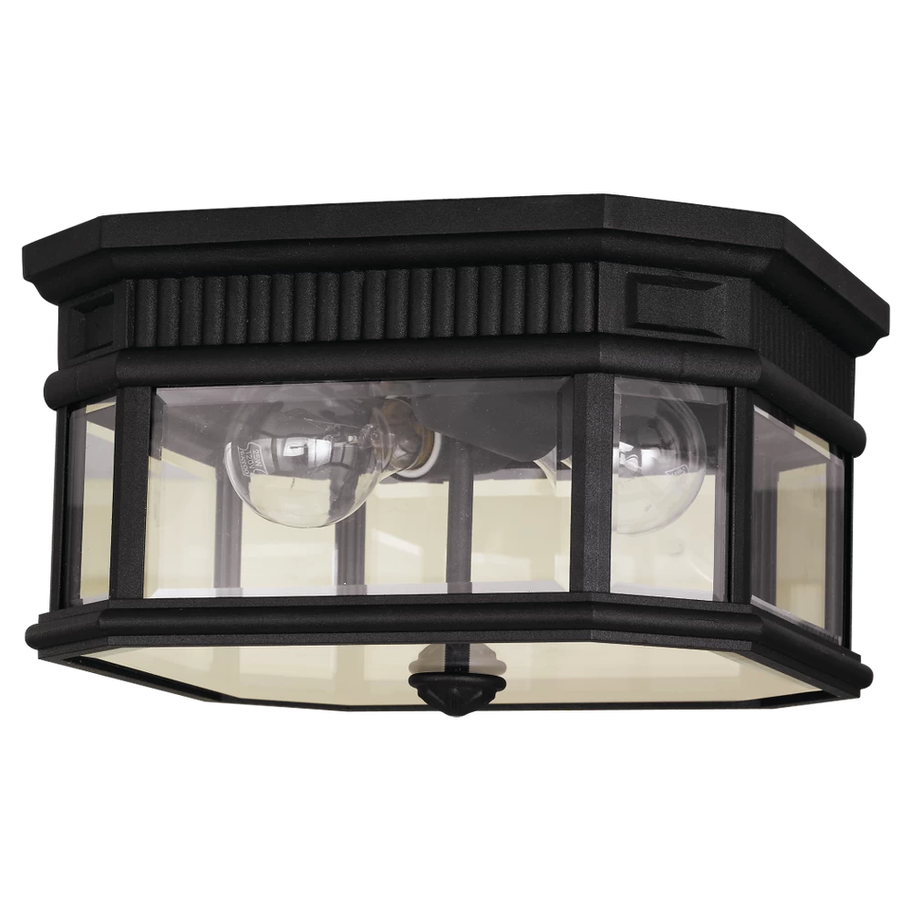 The Cotswold Lane Outdoor Ceiling Flush Mount features a Grecian Bronze or Black finish with Clear Beveled Clear Seeded glass. Two 60 watt max 120 volt medium base bulbs are required, but not included. 11.5 inch width x 6.6 inch height. ETL Listed for damp locations.