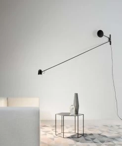 The Counterbalance Plug-in Wall Light seems to defy the laws of physics. Positioned as desired in space, this piece, with its position variation, suggests the dynamic equilibrium of a sculptural mobile. Equipped with a fluid balancing system using gear wheels, the counterweight compensates for the movements of the long arm and ensures stability of the diffuser. Structure in painted steel and head in aluminum in Black finish. Includes step dimmer (0/50/100%).