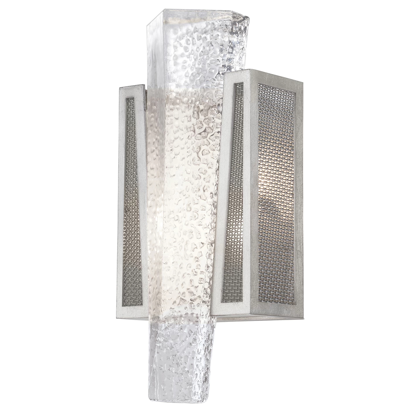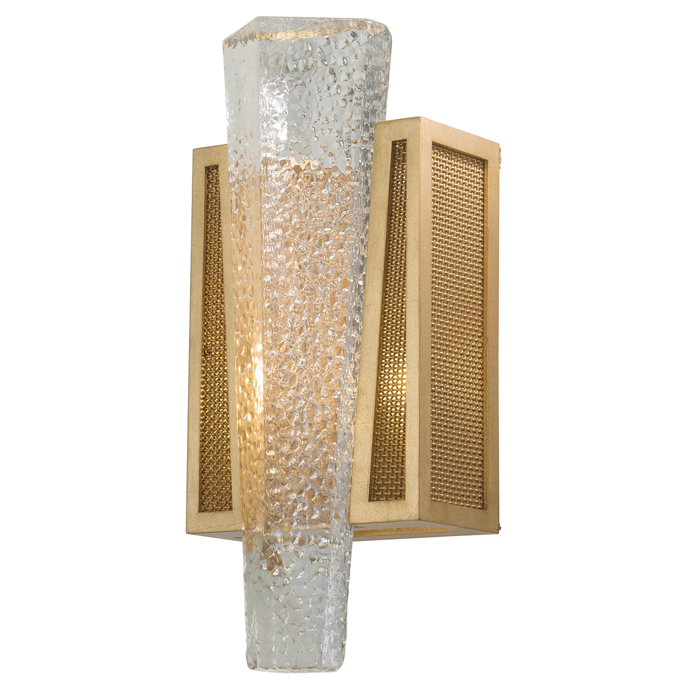 The Crownstone Wall Light offers a look inspired by the Romans, transforming classical architecture with glass to create a piece unique for the modern day, featuring a textured Clear glass panel set into a metal frame with fabric or mesh side panels. Available finished in Gold Leaf with Gold Mesh or Fabric or in Silver Leaf with Silver Mesh or Fabric. UL and cUL listed. Made in the USA.