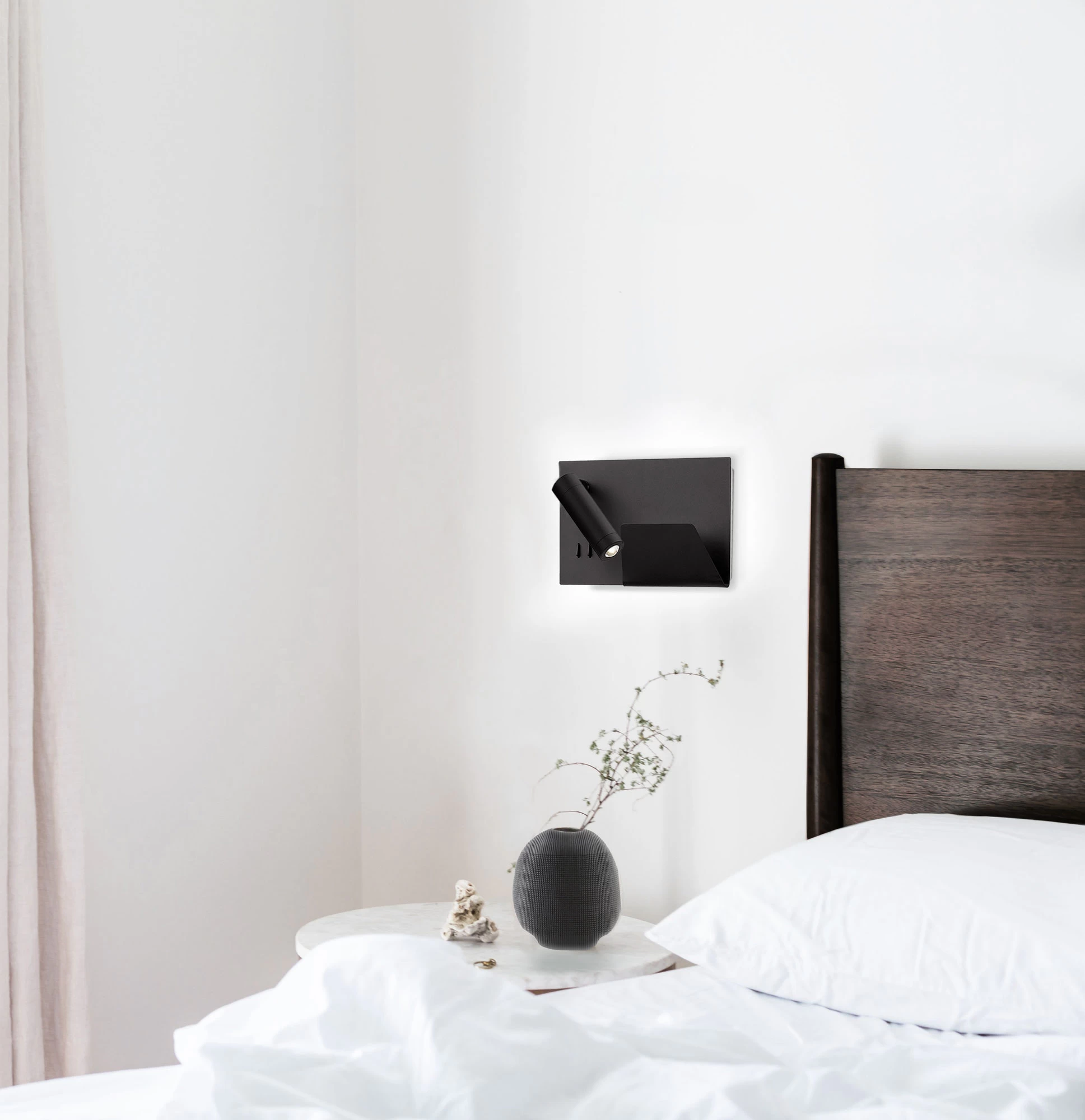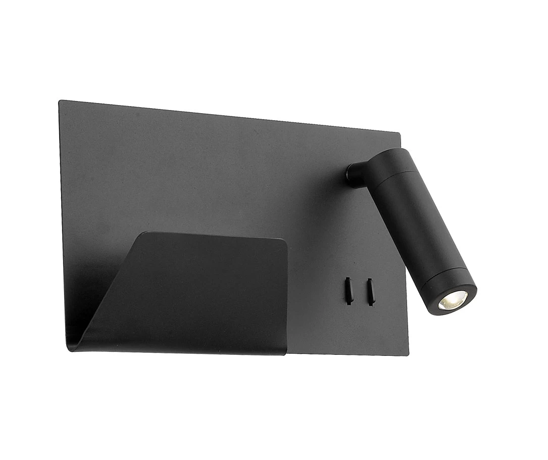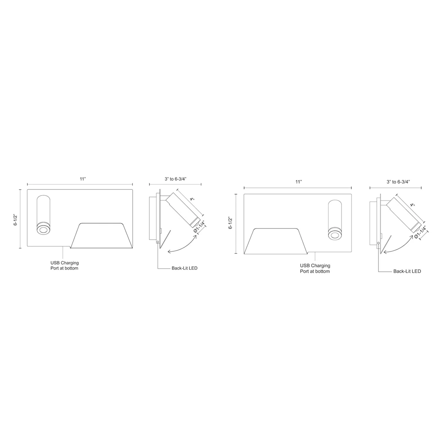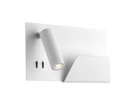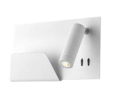 The Dorchester Wall Light with Holder would be an ideal night light. Features an adjustable cylindrical aluminum spot light attached to rectangular wall mount with a book holder. Available with light on left or right side. Finely textured achromatic powder-coat finish in Black or White. Frosted acrylic ambient light. On/off switch controls light source. USB charging port.