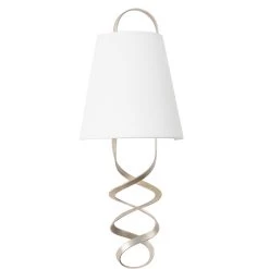 The Dota Wall Sconce’s gorgeous flowing lines are the highlight of this playful yet elegant sconce. Curved metalwork finish twists and swirls in a tranquil loop that draws the eye and creates an open, airy spiral silhouette against the wall. The tapered white linen shade grounds the design and adds a traditional element that makes the piece extremely useable.