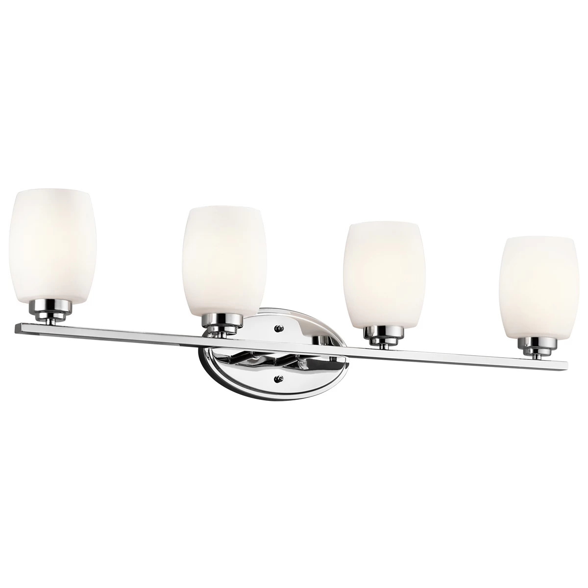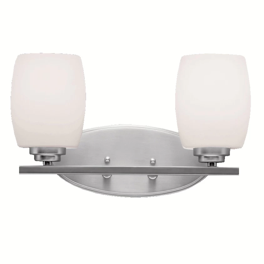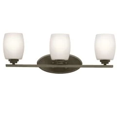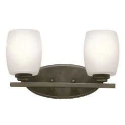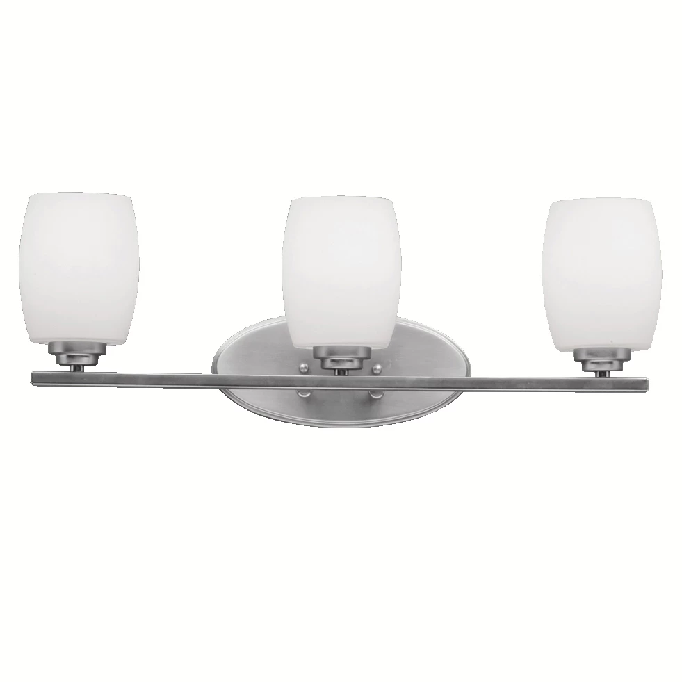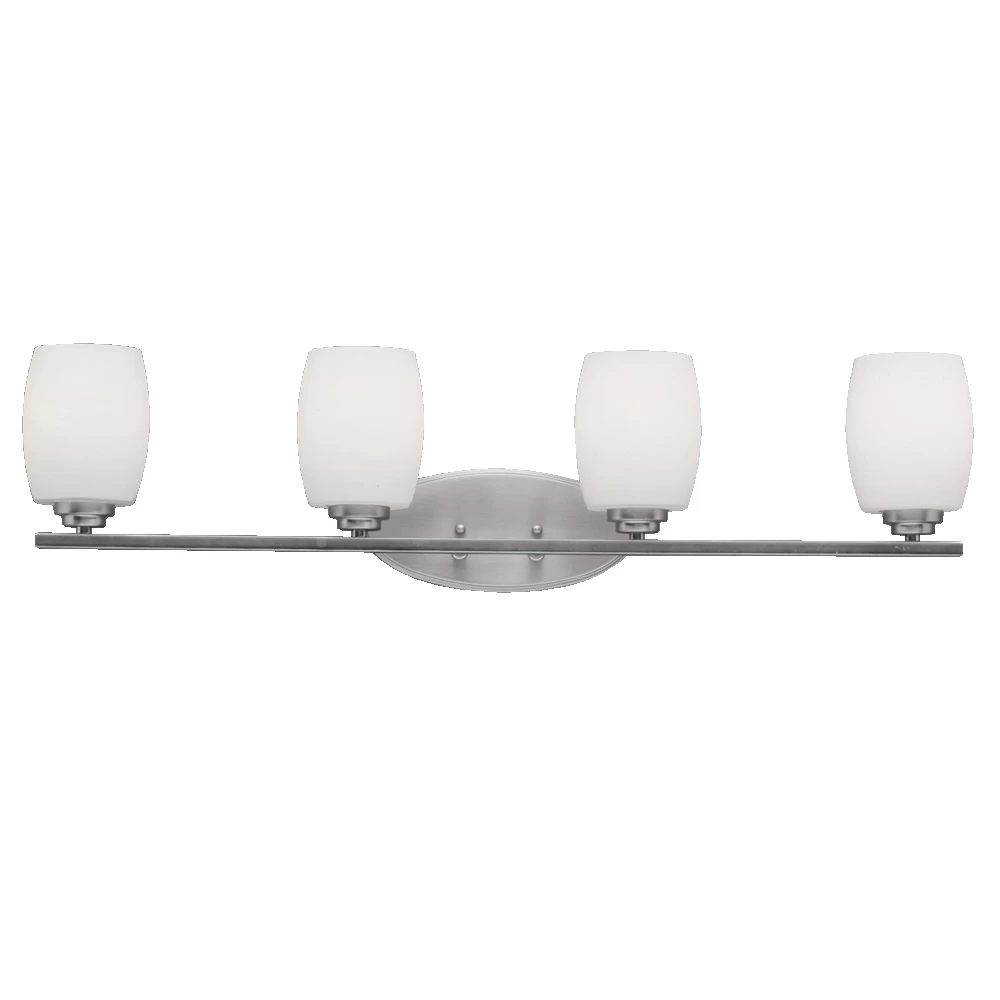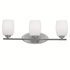 The Eileen Bathroom Vanity Light features clean, straight lines which perfectly complement a wide range of interior styles. Available in Chrome, Brushed Nickel, or Olde Bronze with Satin etched glass shades. Available with two, three or four lights. Two lamping options to choice from. ETL rated for damp locations.