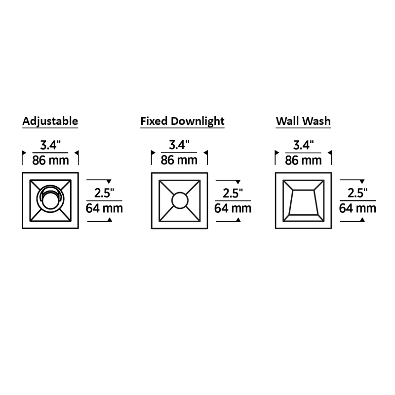 Three trim types are available: adjustable (35 degree tilt, 360 degree rotation), fixed downlight, and wall wash. The adjustable and fixed downlights include a 40 degree beam angle optic, and optional optics in other beam angles are sold separately.