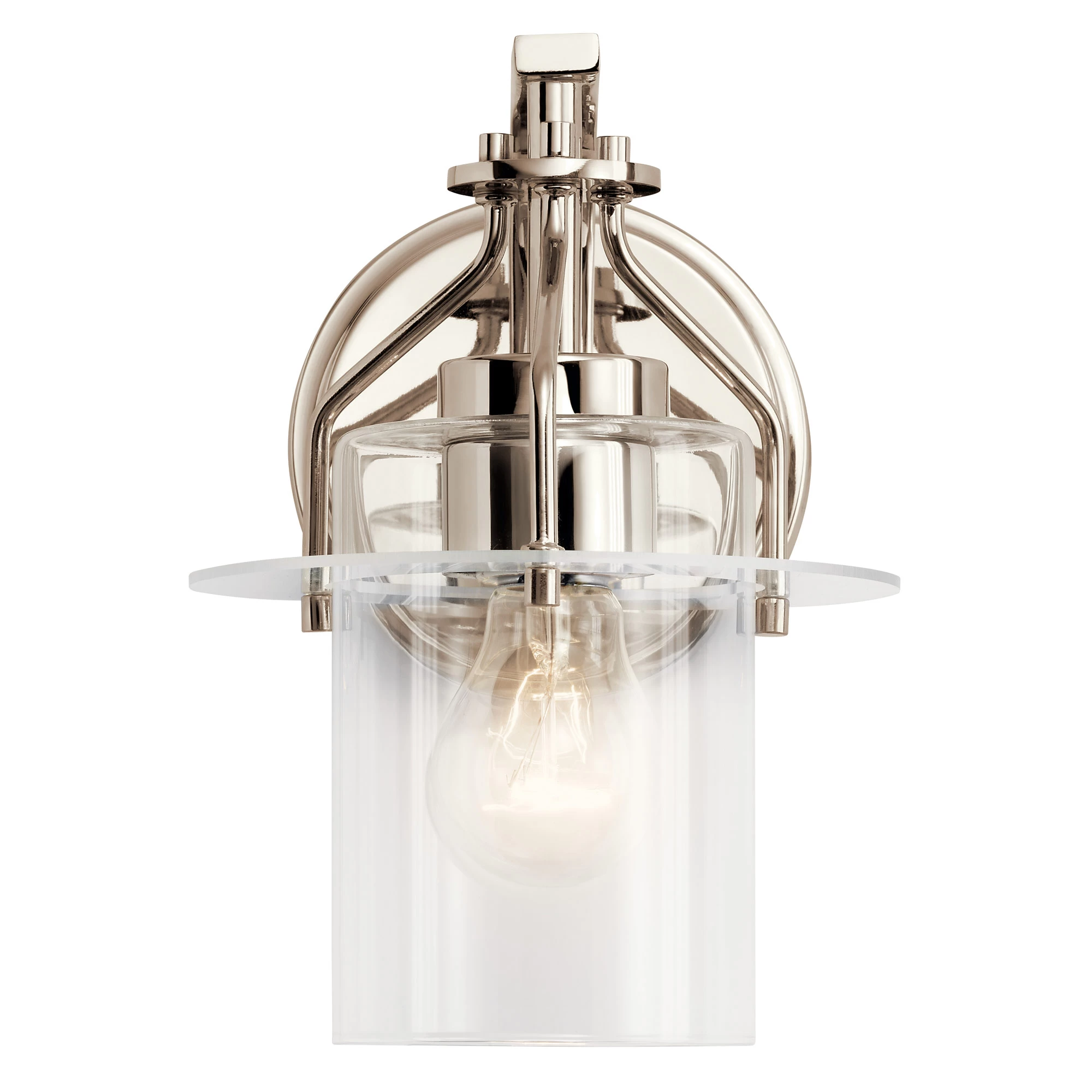 With its unique industrial glam design, the Everett Wall Sconce demands a double-take. The sleek glass shade is embellished with a clear disc that adds dimension, most dramatic when illuminated. Rich in details, from the pronounced bolt hardware to the thin bent rods holding the discs in place, this sconce adds sophisticated flair to your space. It can be installed facing up or down.