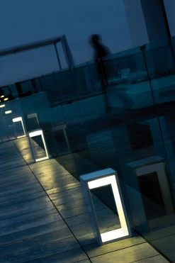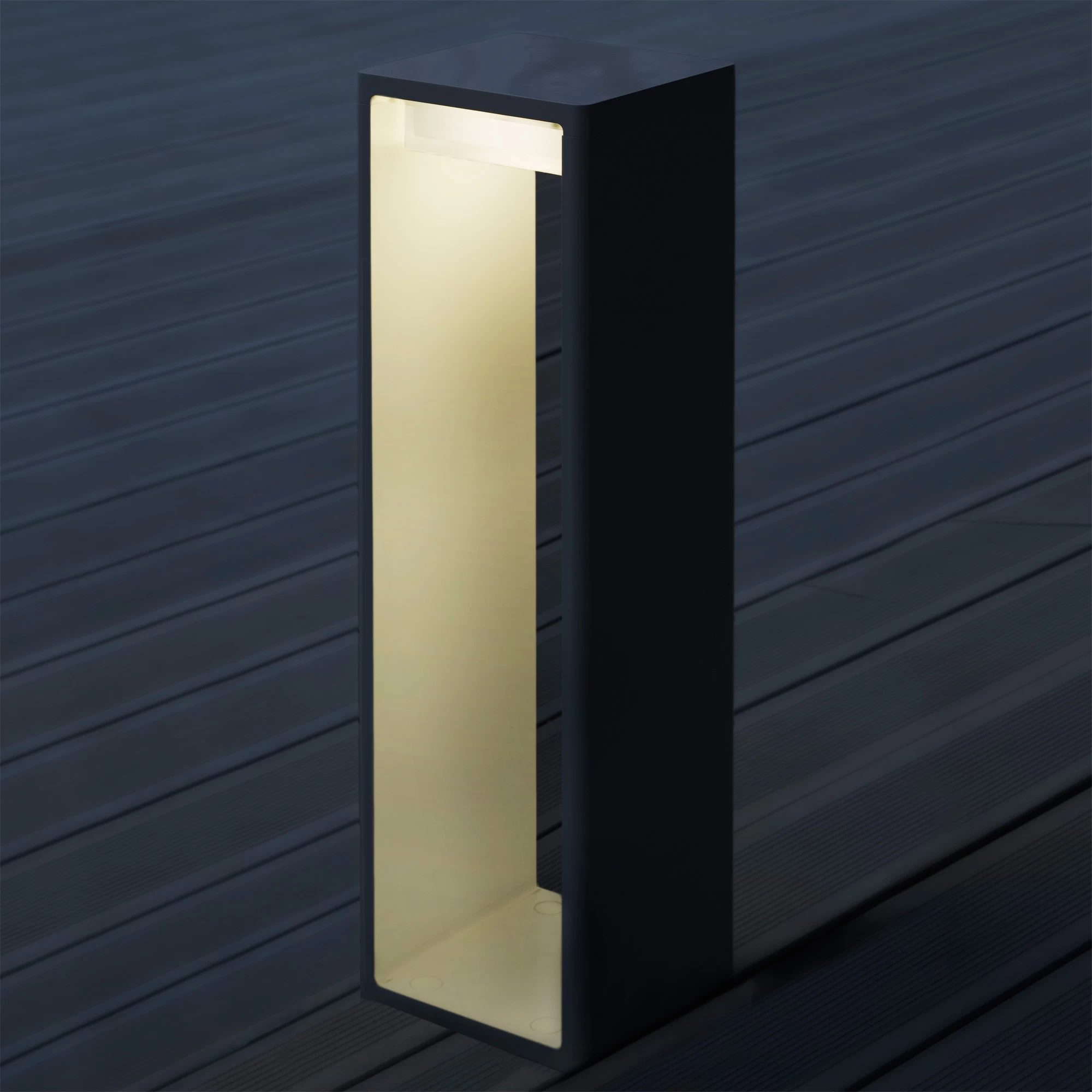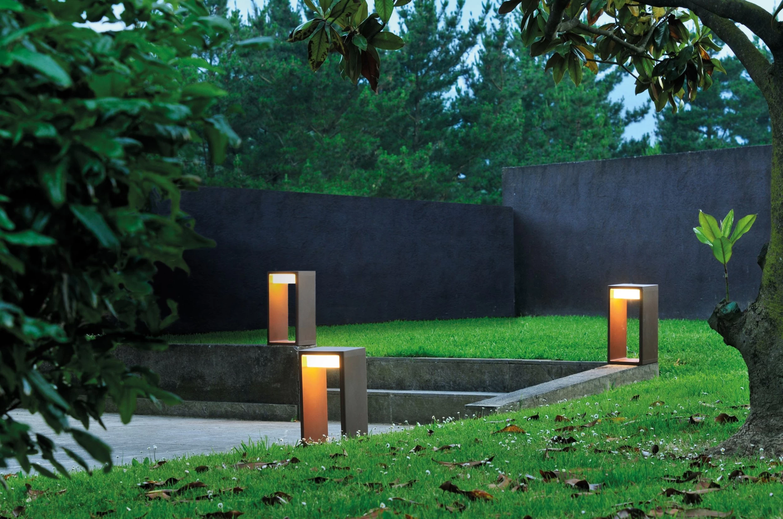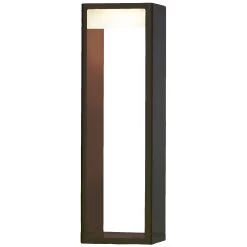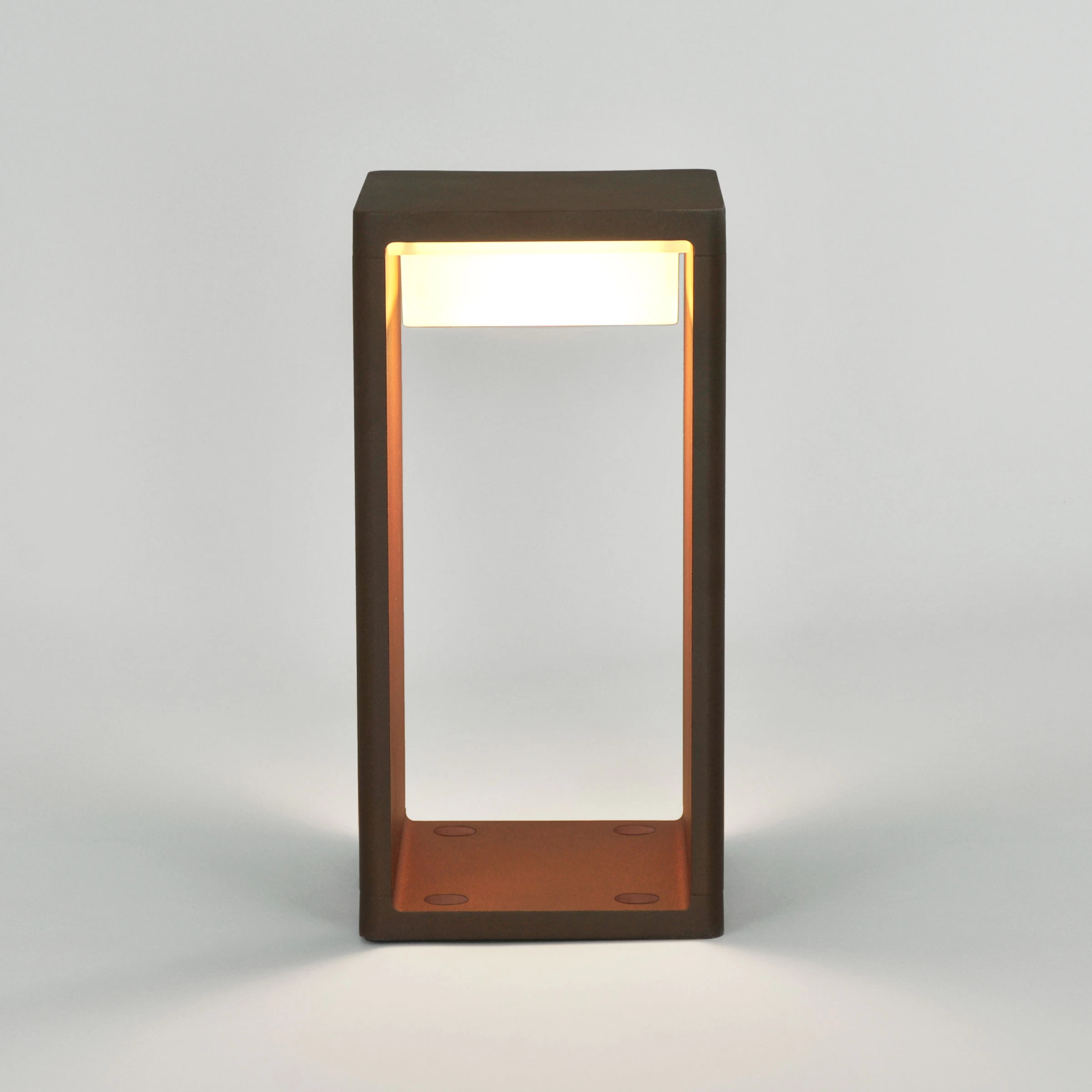 The Frame Outdoor Lamp offers a striking look, featuring an open rectangular silhouette composed of aluminum with a pressed glass diffuser. Available in three sizes finished in White, Gray, Bronze, or Corten. CE and cUL listed for wet locations.