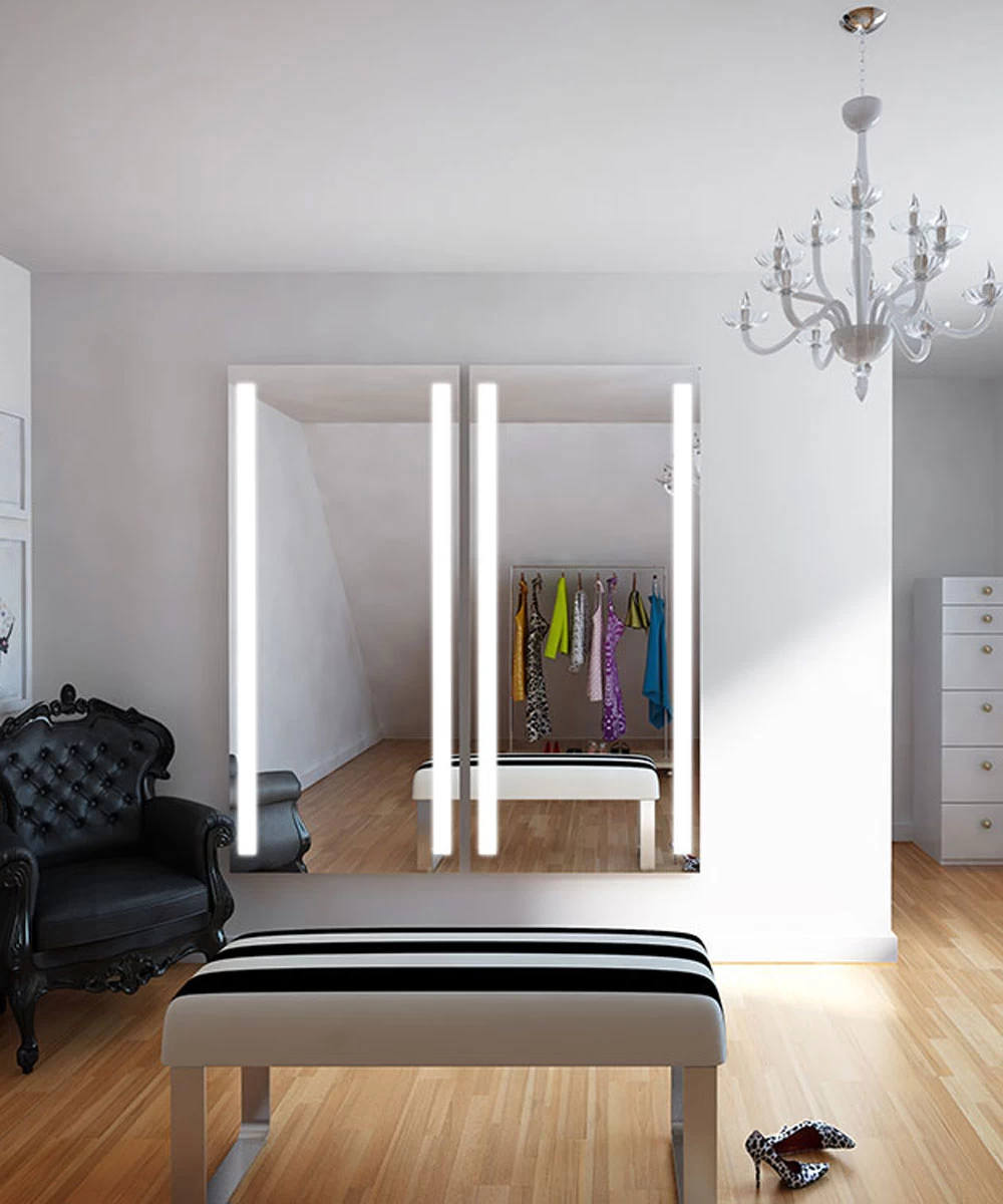 The Fusion Lighted Wardrobe Mirror will add a modern statement of prestige while acing as a prominent focal piece for bedrooms, bathrooms and walk in closets. White powder coated chassis for finished side view. Corrosion resistant DuraMirror glass.