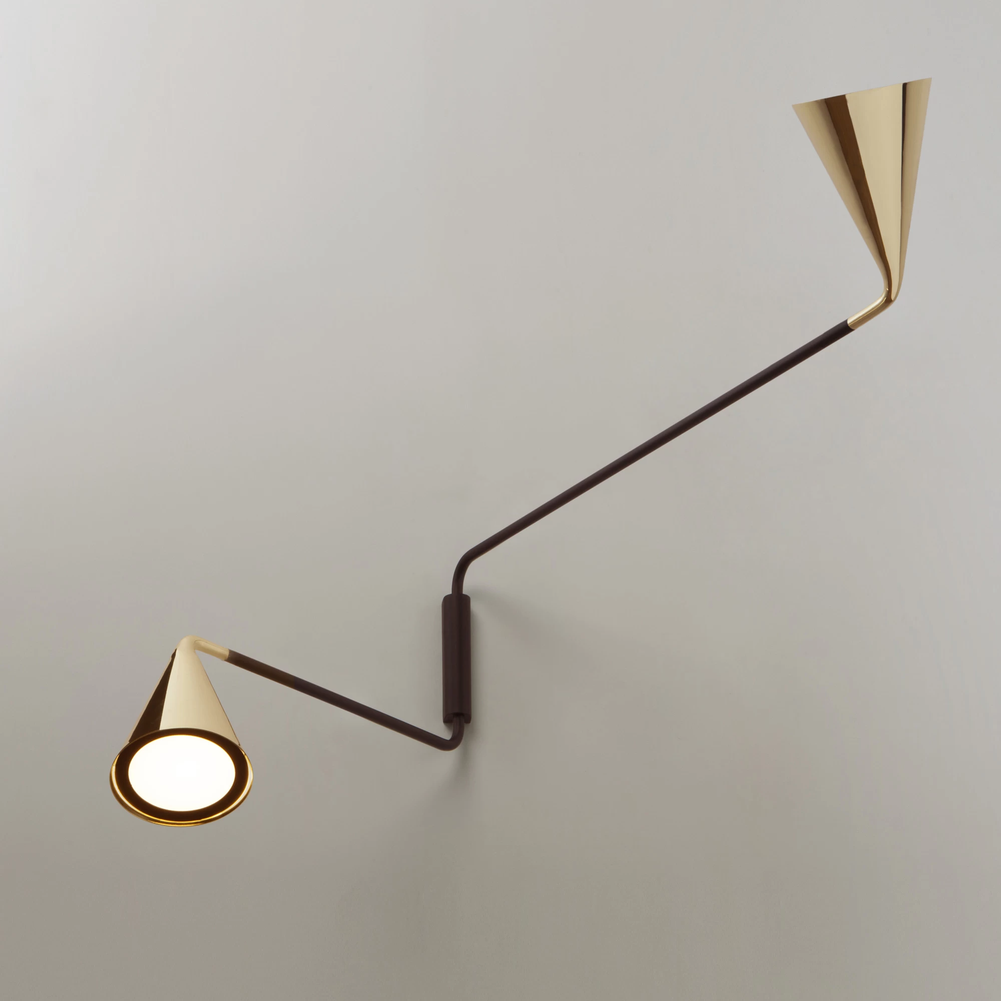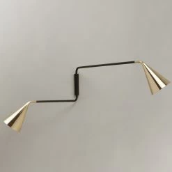 The Gordon Double Wall Sconce has a formal and material interpretation of the conical diffuser that is the main feature of the Gordon product line from Tooy. Two adjustable cones extend from the Gordon’s centerpoint and provide ample lighting for both tasks and ambience. Adjustable direct light 270 degrees. Available with a Matte Black finish complemented by a Black, Polished Gold, Black Chrome, or Brushed Brass colored shade. Includes cord and plug. CE Listed.
