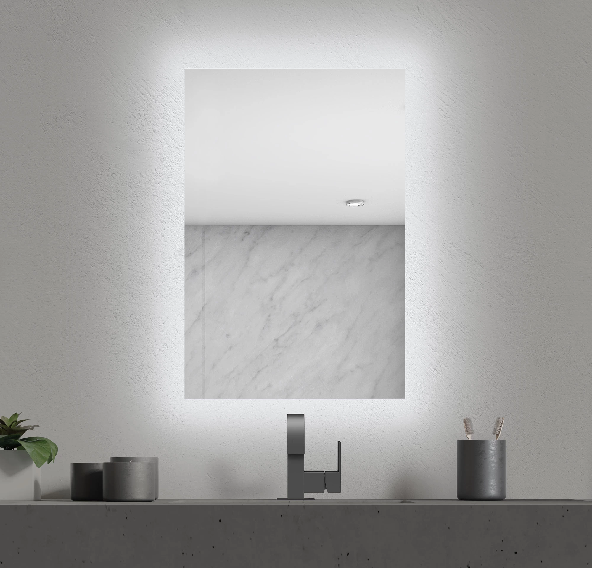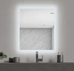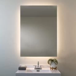 The Halo Lighted Mirror is backlit with LED strips on all 4 mirror sides, providing a subtle layer of accent lighting to the bathroom vanity and casting an ambient glow on the wall Available in two sizes. Mounts vertically. ETL listed. Damp Location. Title 24 compliant.