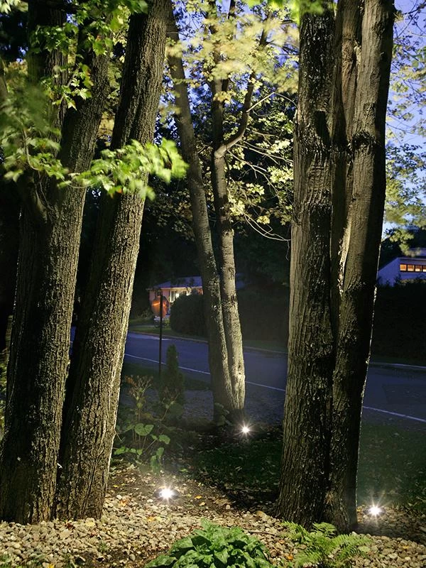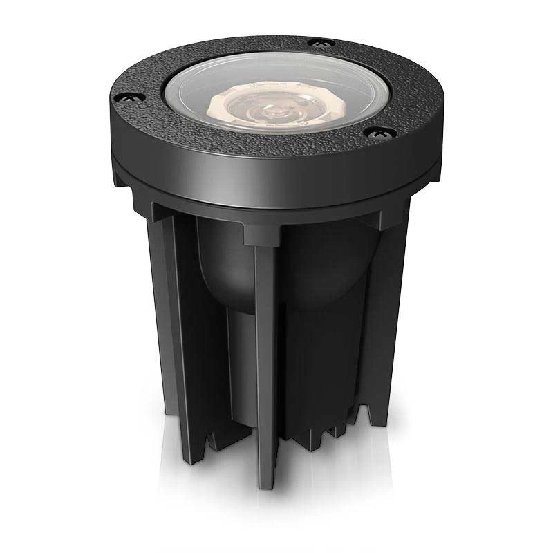 IL9 FlexScape LED Inground Luminaire is designed for optimal LED performance and superior flexibility. The luminaire creates visual interest for pathways, walls, columns and foliage. Its rugged injection molded housing installs directly into the soil. Features molded-in brass inserts for repeatable opening and closing, and lens ring secured with three screws that clamp lens and molded silicone gasket into place. Includes 10 watt single Luxeon M LED with choice of 3000K or 4000K color temperature, 70CRI, and 12 volt Class 2 driver with integral switch providing customer access to the adjustment between four light levels. Low iron tempered clear glass lens with molded gasket which slips onto lens without tools. Zoomable optic made of injection molded clear acrylic with select surfaces textured. Lens provides narrow 15 degree to medium 35 degree beam pattern, depending on the position, or wide 60 degree flood output. ETL listed for wet locations. IP67 rated. 5 year warranty. 4.11 inch diameter x 5.04 inch height. Requires 12 volt remote transformer, sold separately.