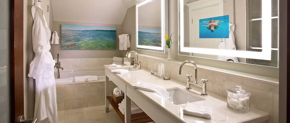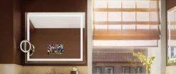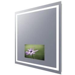 The Integrity Lighted Mirror with TV is designed to maximize direct illumination. Ideal for precision tasks such as makeup application and shaving. White powder coated chassis for finished side view. Corrosion-resistant OmegaMirror with Spectrum mirror glass technology. 15.6 or 21.4 inch LED HDTV with HDMI, RF and component connections. Integrated speakers for high quality stereo sound. Electric Mirror’s Spectrum Mirror TVs are best suited for bathrooms that are not overly bright. When the TV is off, the screen area is camouflaged, leaving only a light gray image where the TV is located. Waterproof remote included.