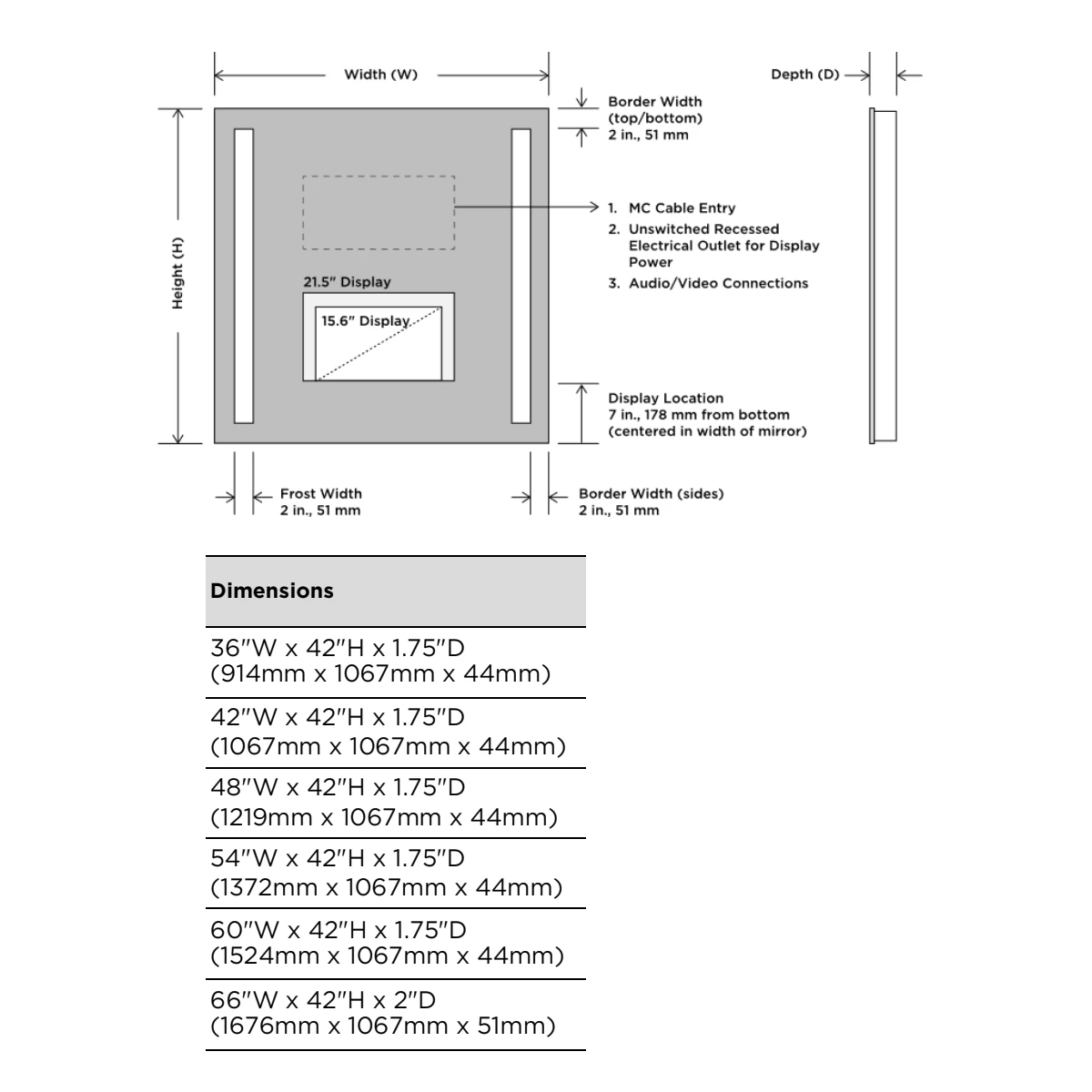 Note: The Integrity TV mirror must be installed in the W x H (width x height) orientation as listed; it cannot be installed in any other direction.