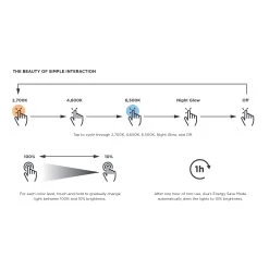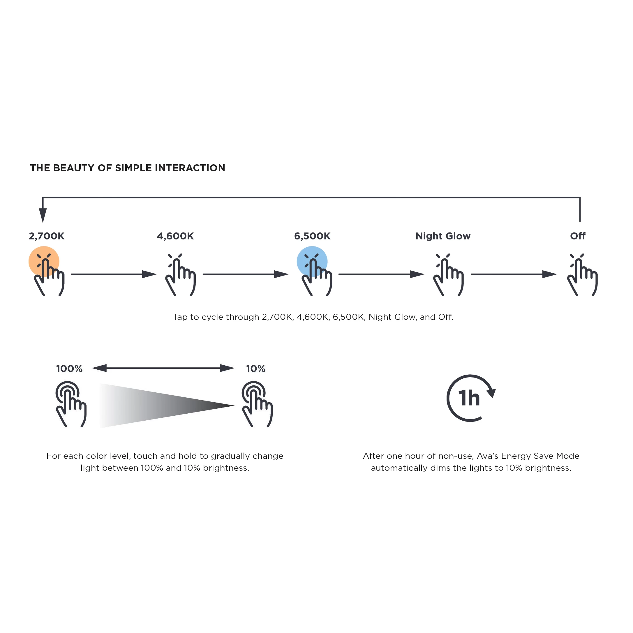 Ava Smart Look technology features tunable white LED lights that allow you to select the color temperature. Select between 6500K for a day of outdoor activities, 4600K for your daily routine, or 2700K for a night out on the town. Tap to Cycle through 2700K, 4600K, 6500K, Night Glow and Off. At every level, hold to dim down to 10%. After one hour of non-use, Energy Save Mode automatically dims lights to 10%.