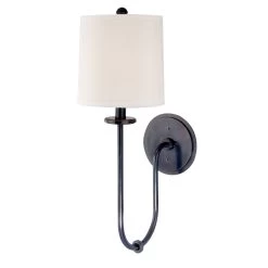 The Jericho Wall Light features a curved arm which dips steeply from a circular backplate and is available in Aged Brass, Old Bronze, Polished Nickel, or Historic Nickel. One 60 watt max 120 volt B10 candelabra base bulb is required, but not included. 7 inch width x 20.5 inch height x 10.5 inch depth. UL listed.