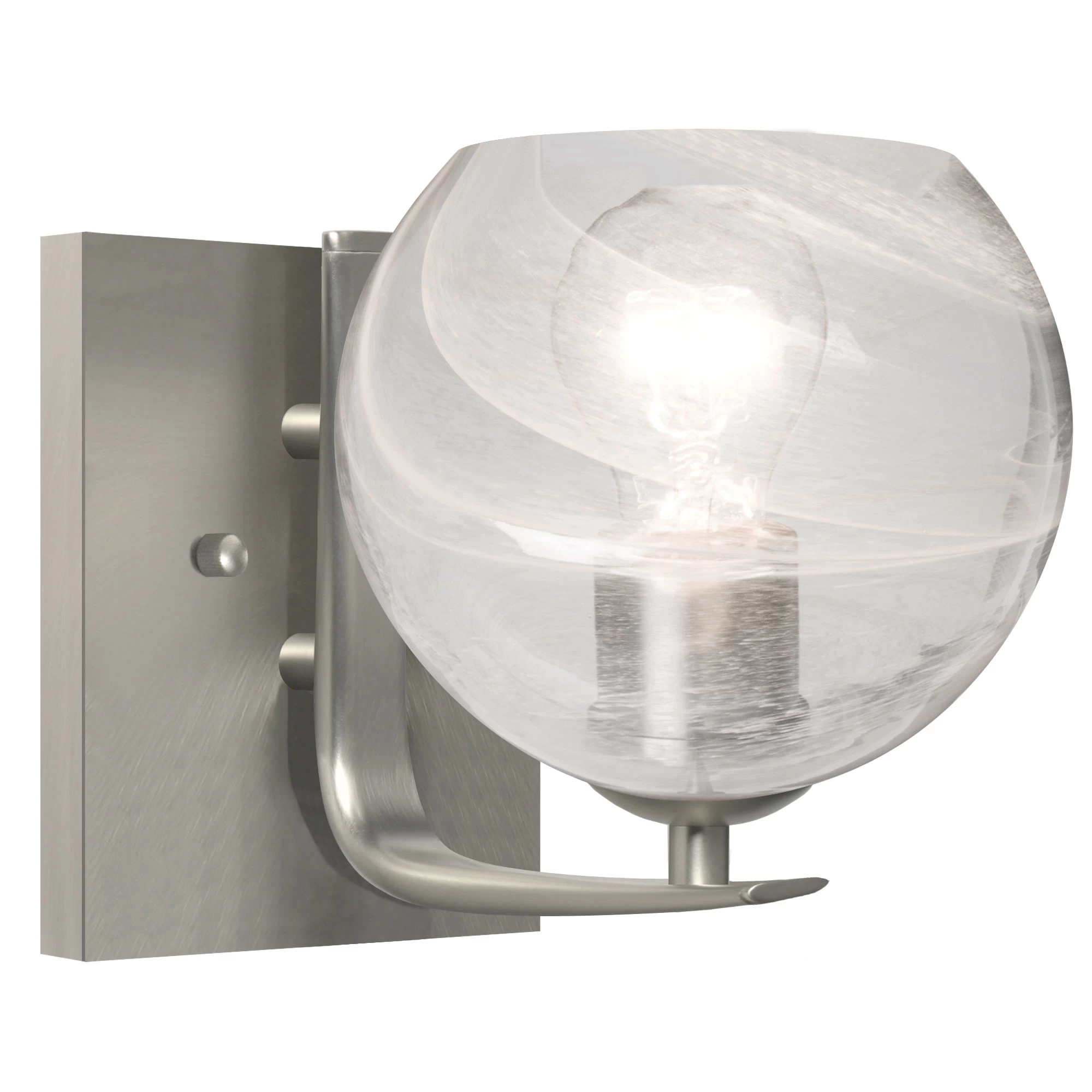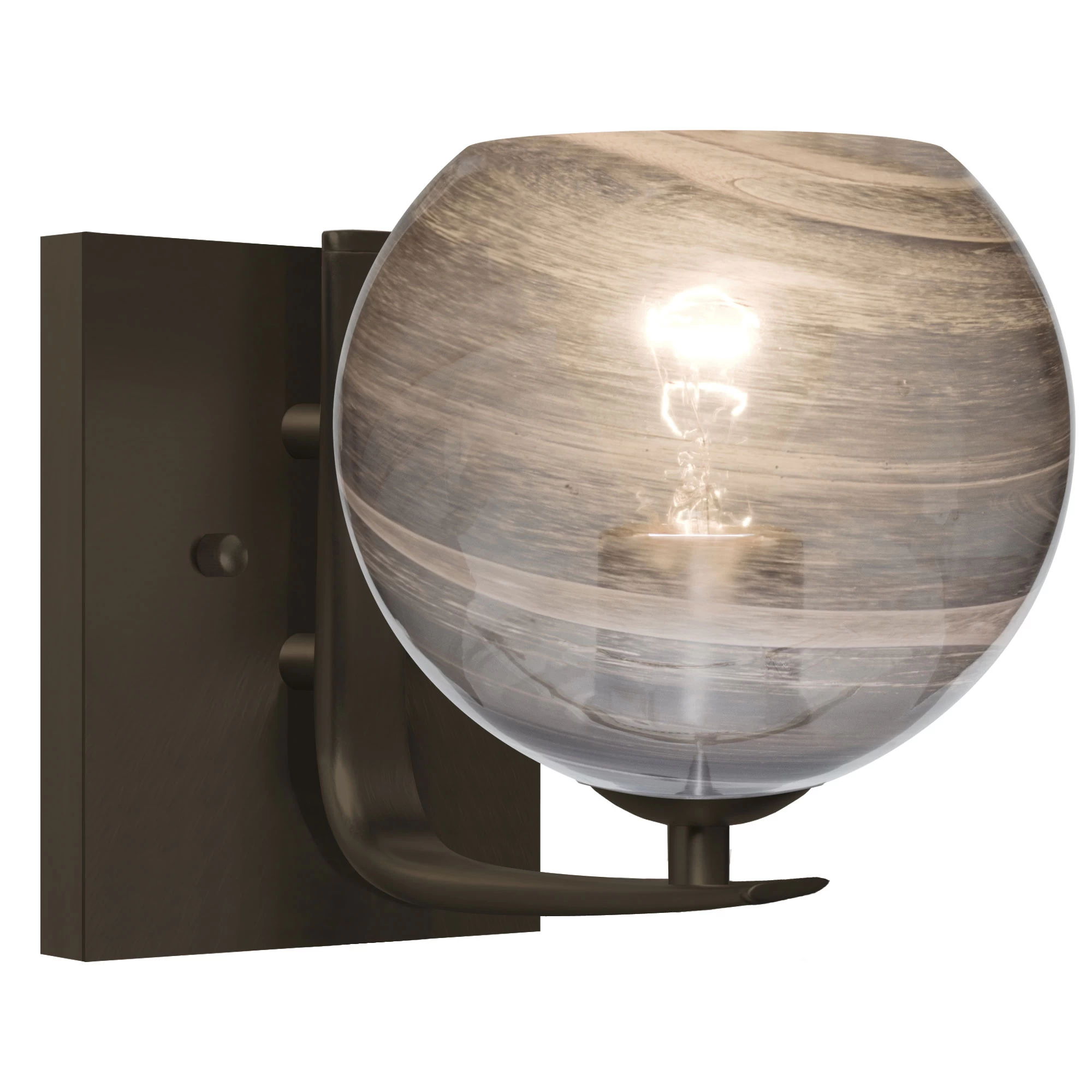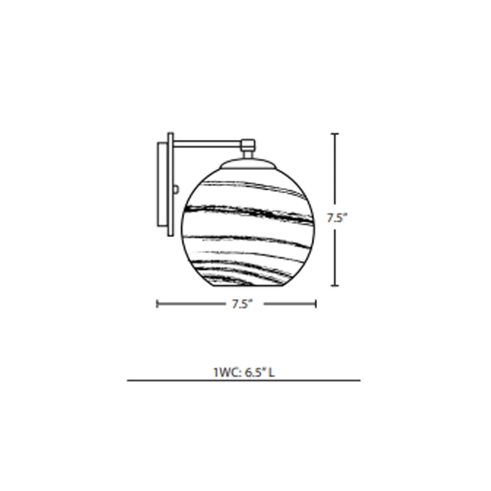 The Jilly Wall Light features a contemporary design composed of a transparent Amber, Clear or Smoke glass globe, with a mysterious vapor-like patterning throughout the glass to partially conceal the inner portion of the shade. The globes rest on a smooth bracket finished in Bronze or Satin Nickel. The play of light through the vapor glass makes for a pleasing optical affect, enhanced by the exposed light source positioned inside the shade. Can be mounted with glass shades point up on down. UL listed for damp locations. Title 24 compliant.