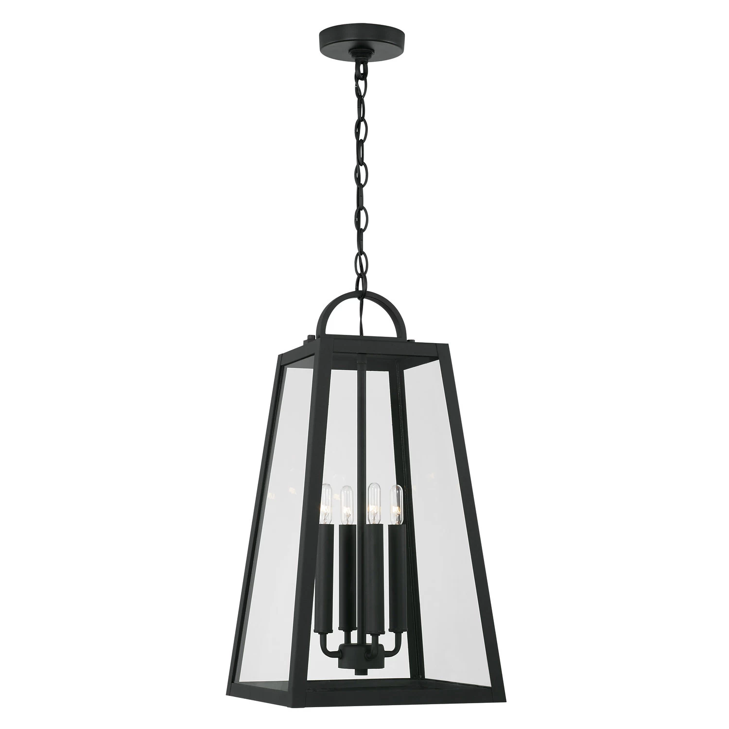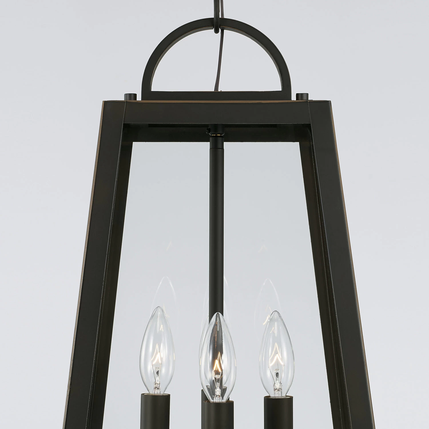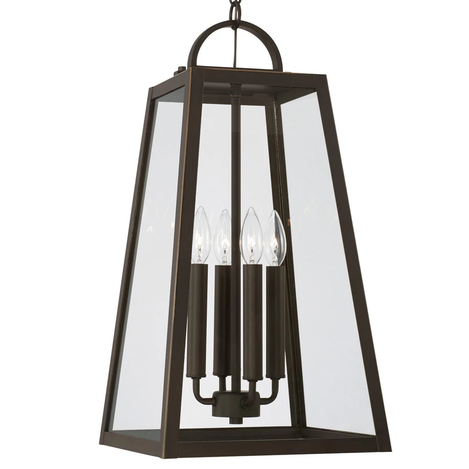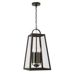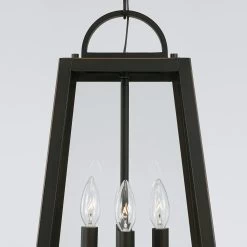 With its simplified geometric frame of heavy, slanting lines, the Leighton Outdoor Pendant is a refresh of the classic lantern. Its traditional roots are maintained by the handle-like loop and candlestick lamp holders. The Leighton is perfect for adding a bold, modern accent to porticos and patios. Suitable for use in covered outdoor locations.